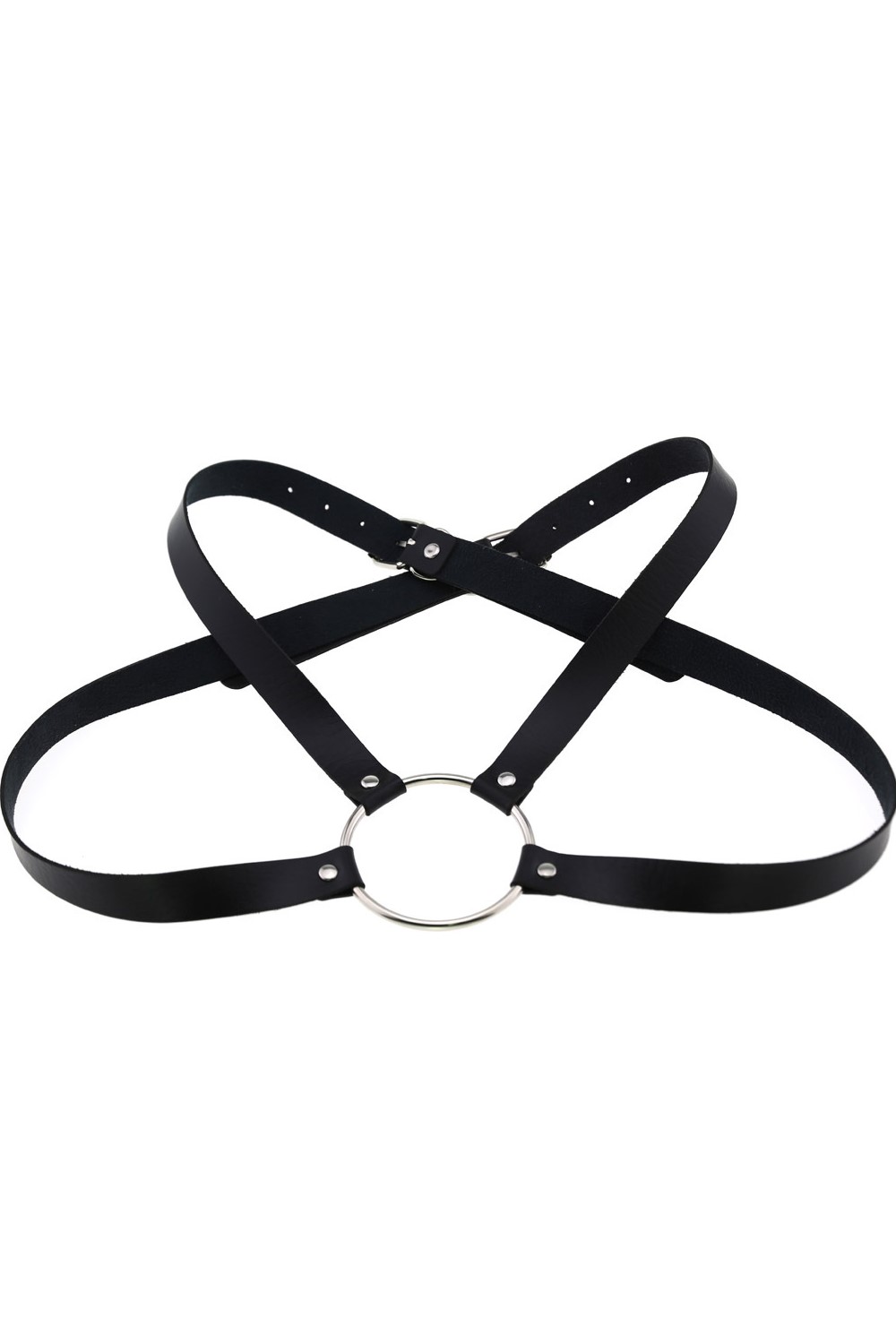 Die überkreuzten Riemen führen zu einem großen Metallring, der als zentrales Highlight dient.