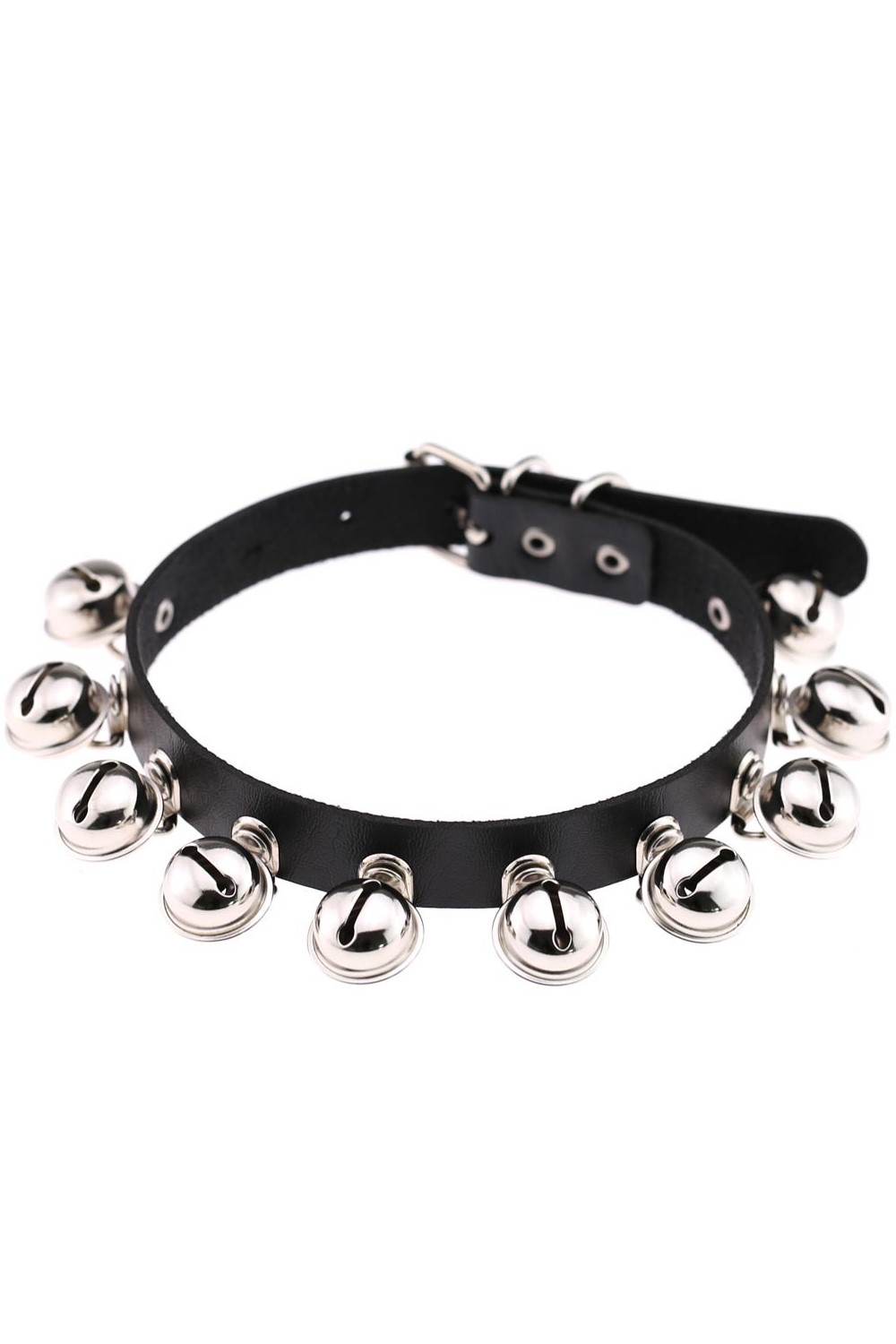 The black choker is adorned with small silver bells all around, which ring softly with every movement.