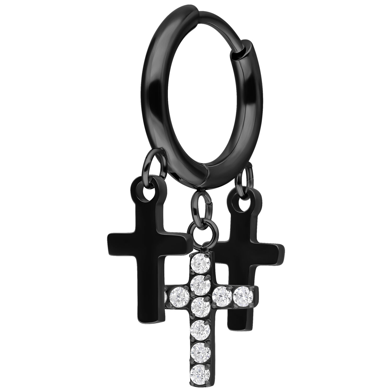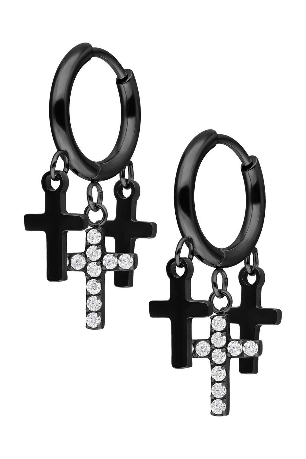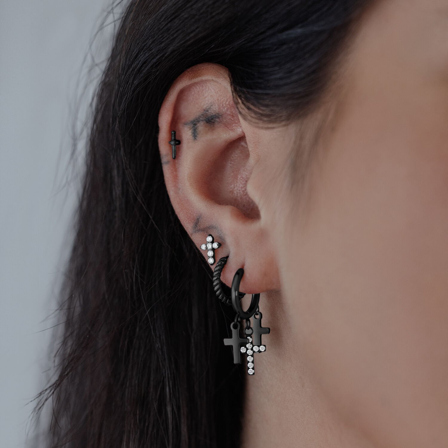 The Wildcat Little Dangling Cross Hoops earrings are small black hinged hoops featuring multiple dangling cross charms, one of which is adorned with sparkling zirconia stones. The combination of a minimalist hoop and detailed charms creates an eye‑catching accessory that pairs effortlessly with edgy, mystical, classic or elegant outfits. The hinged closure ensures easy wear and comfort, even in stretched lobes or tunnels. Crafted from high‑quality 316L surgical steel with a durable PVD finish, these earrings maintain their color and shine over time.