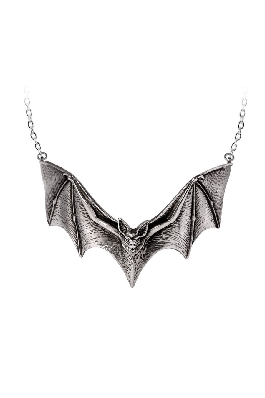The ‘Descending Darkness’ necklace from Alchemy England depicts an imposing bat in descent. Made from fine pewter jewellery, it looks like a dark guardian spirit for all night owls. With a wingspan of 11.5 cm, it attracts everyone's attention - powerful and expressive. The short chain (approx. 30 cm) fits snugly around the neck - perfect for making a dramatic statement. An essential piece of jewellery for gothic fans with a sense of mysticism and dark aesthetics.