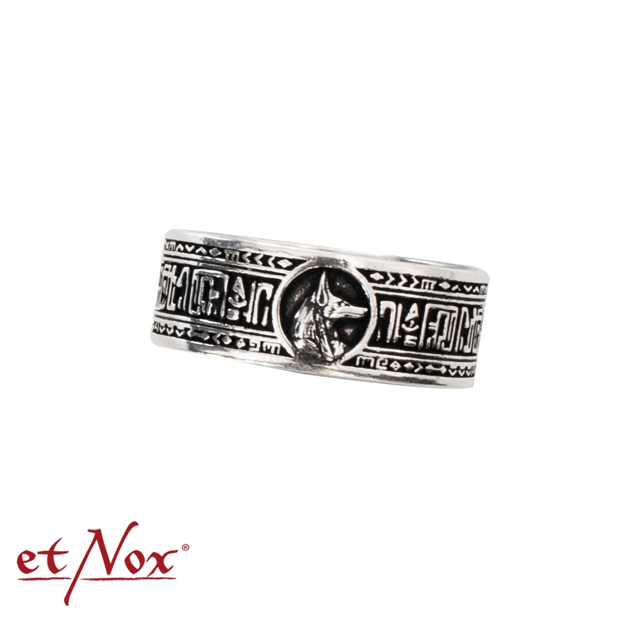Striking gothic ring made of sterling silver, featuring a finely crafted head of Anubis and delicate Egyptian ornaments on either side.