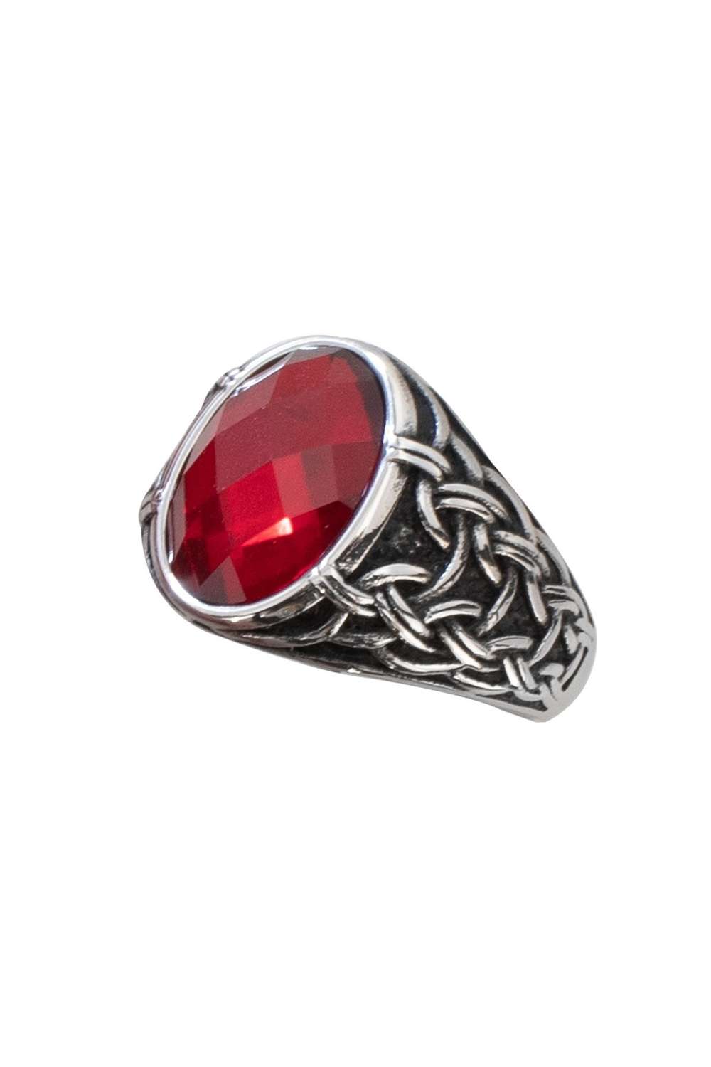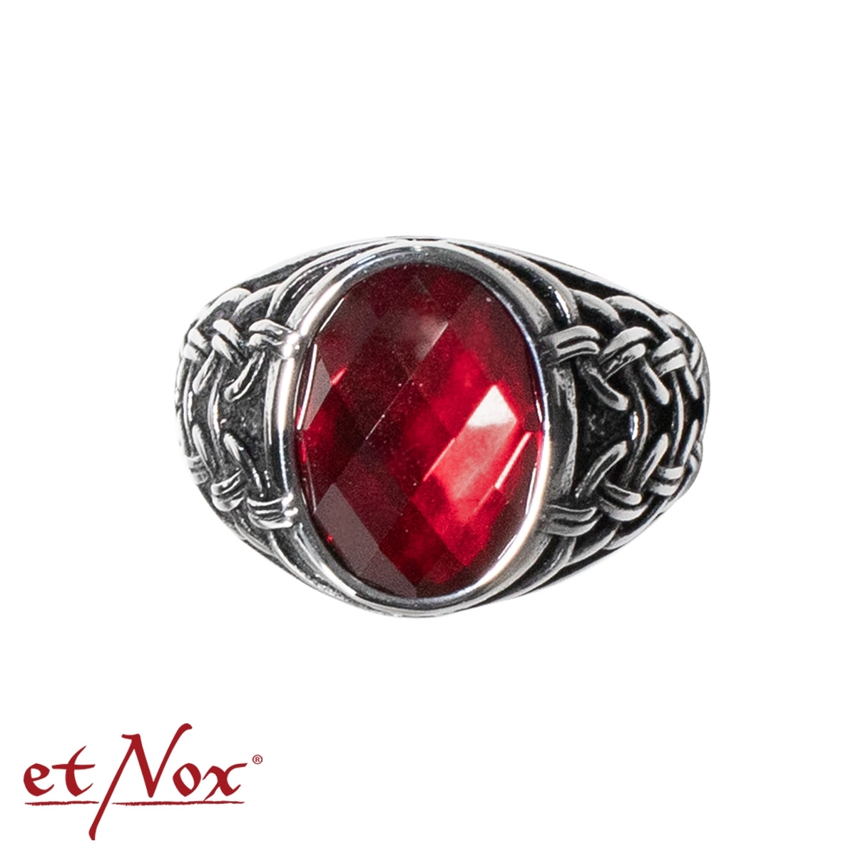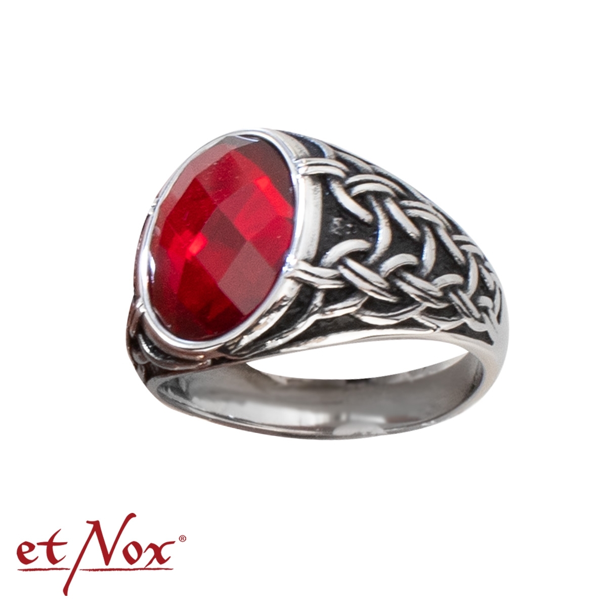 The etNox stainless steel ring combines powerful elegance with detailed craftsmanship. Its artfully braided design frames a bright red, oval zirconia stone, which gives the ring a noble, mystical aura. Made of sturdy stainless steel, it impresses with its durability and comfortable fit. A striking piece of jewelry that harmoniously combines style and strength. Ideal for lovers of expressive accessories with gothic or medieval charm.