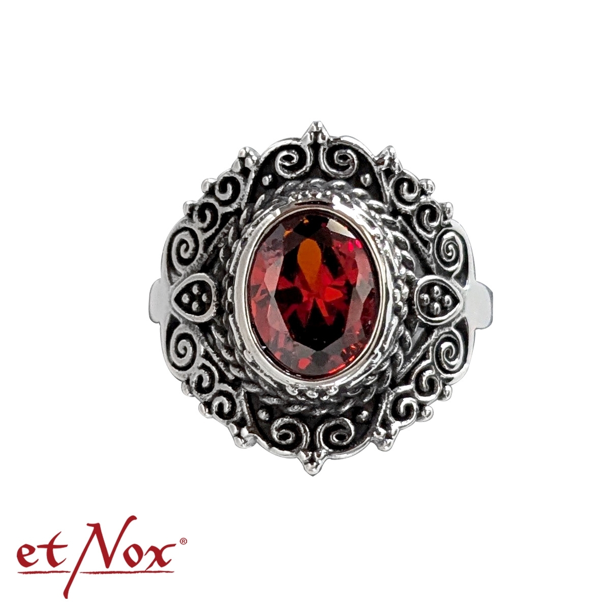 The etNox Red Ornament stainless steel ring features a bold red zirconia stone framed by ornamental detailing, creating a distinctive gothic‑inspired look. Its striking design works well with gothic, urban, or Victorian fashion styles. Made from easy‑care stainless steel, the ring is long‑lasting and skin‑friendly. The vibrant red stone adds eye‑catching sparkle with every movement. Part of the etNox Urban Style collection, this piece represents rebellious and unconventional accessory design. Ideal for anyone seeking jewelry with a strong visual presence.