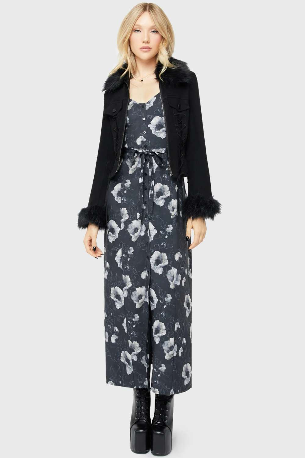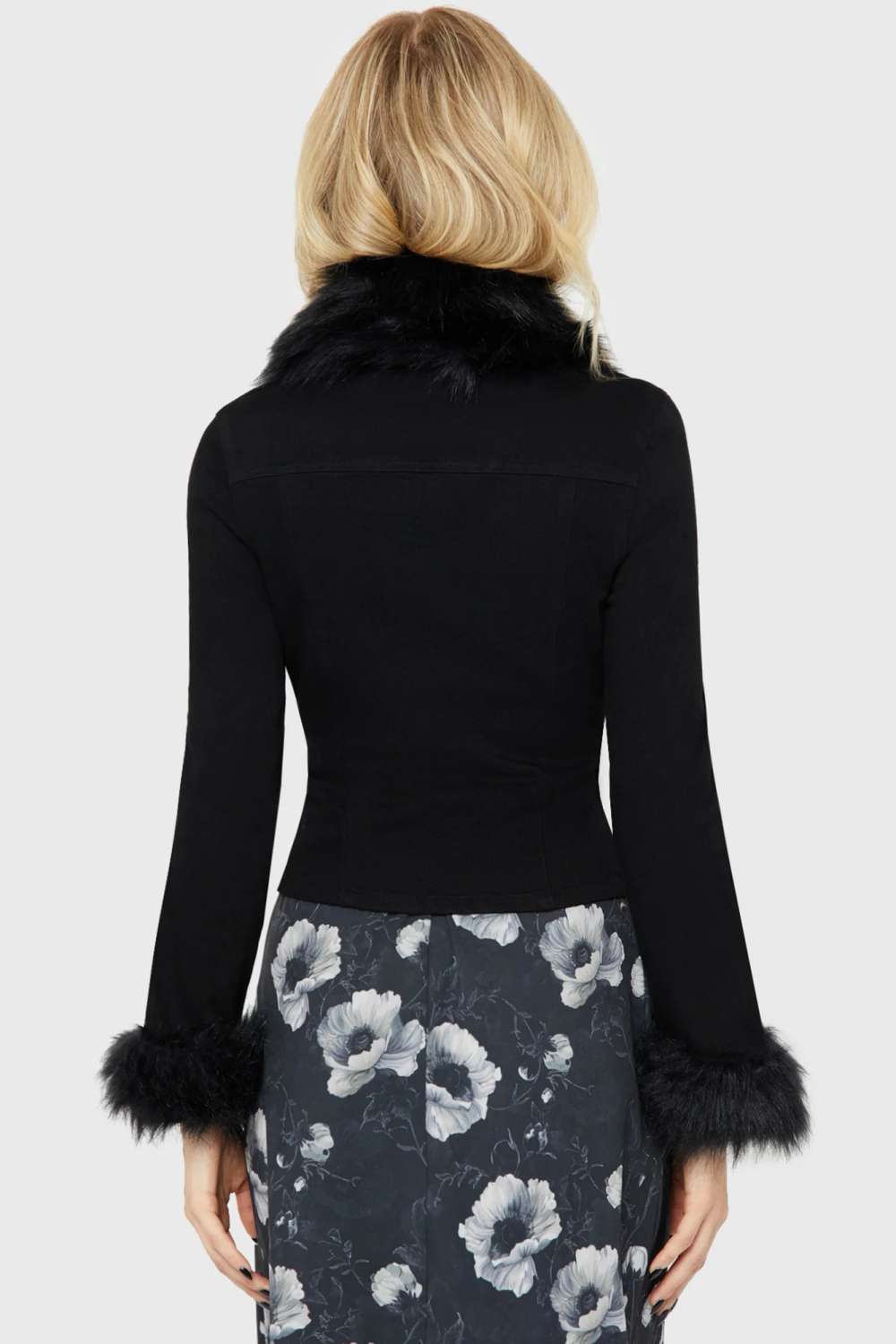 The Killstar Gloom Mist Jacket is a striking denim jacket featuring a detachable faux fur collar and cuffs.