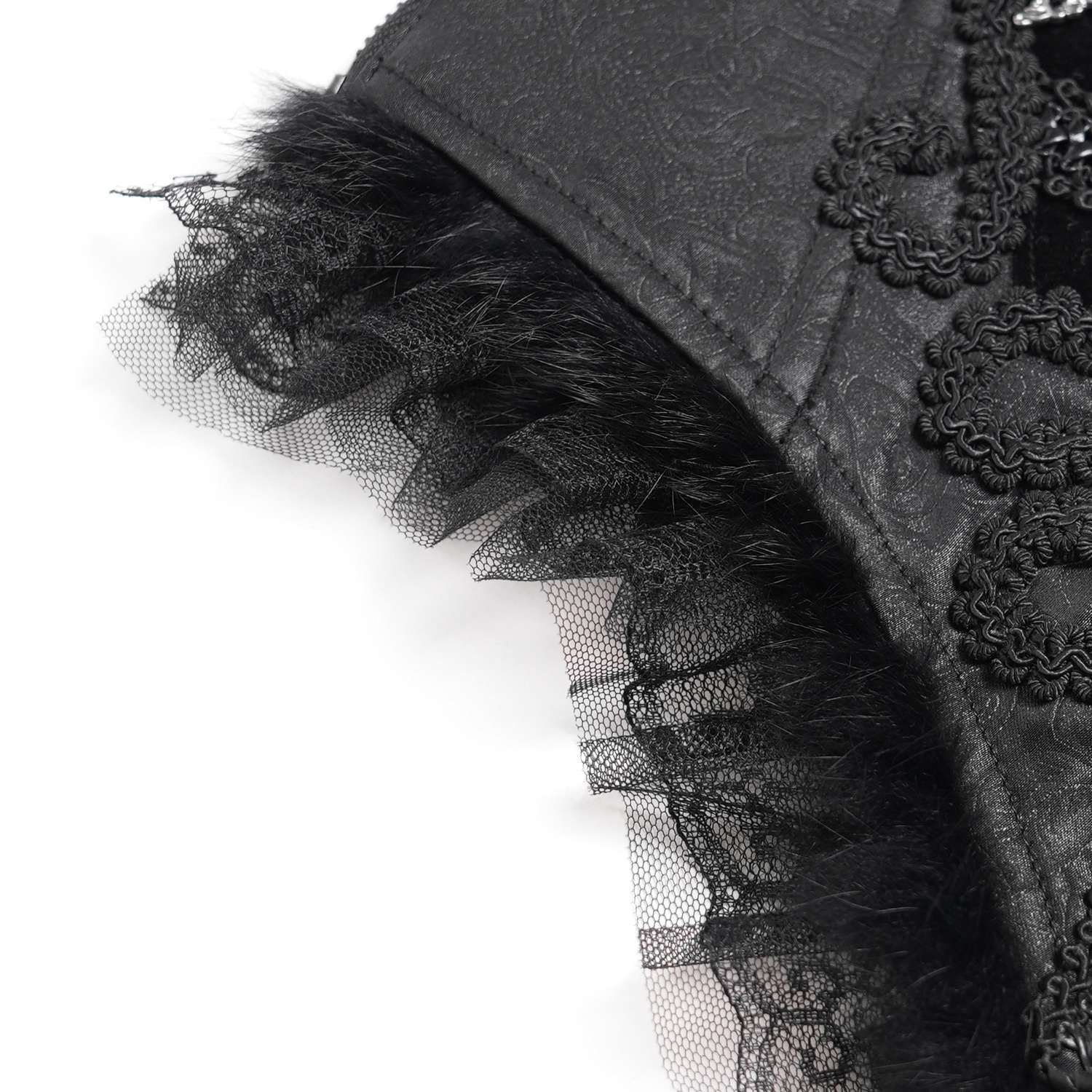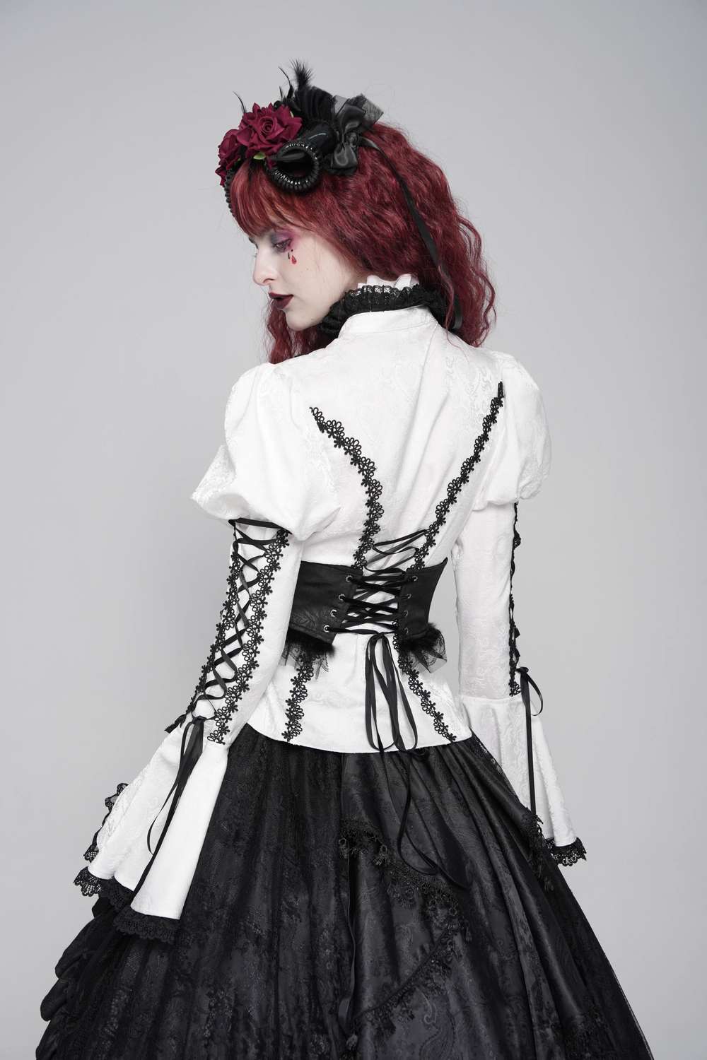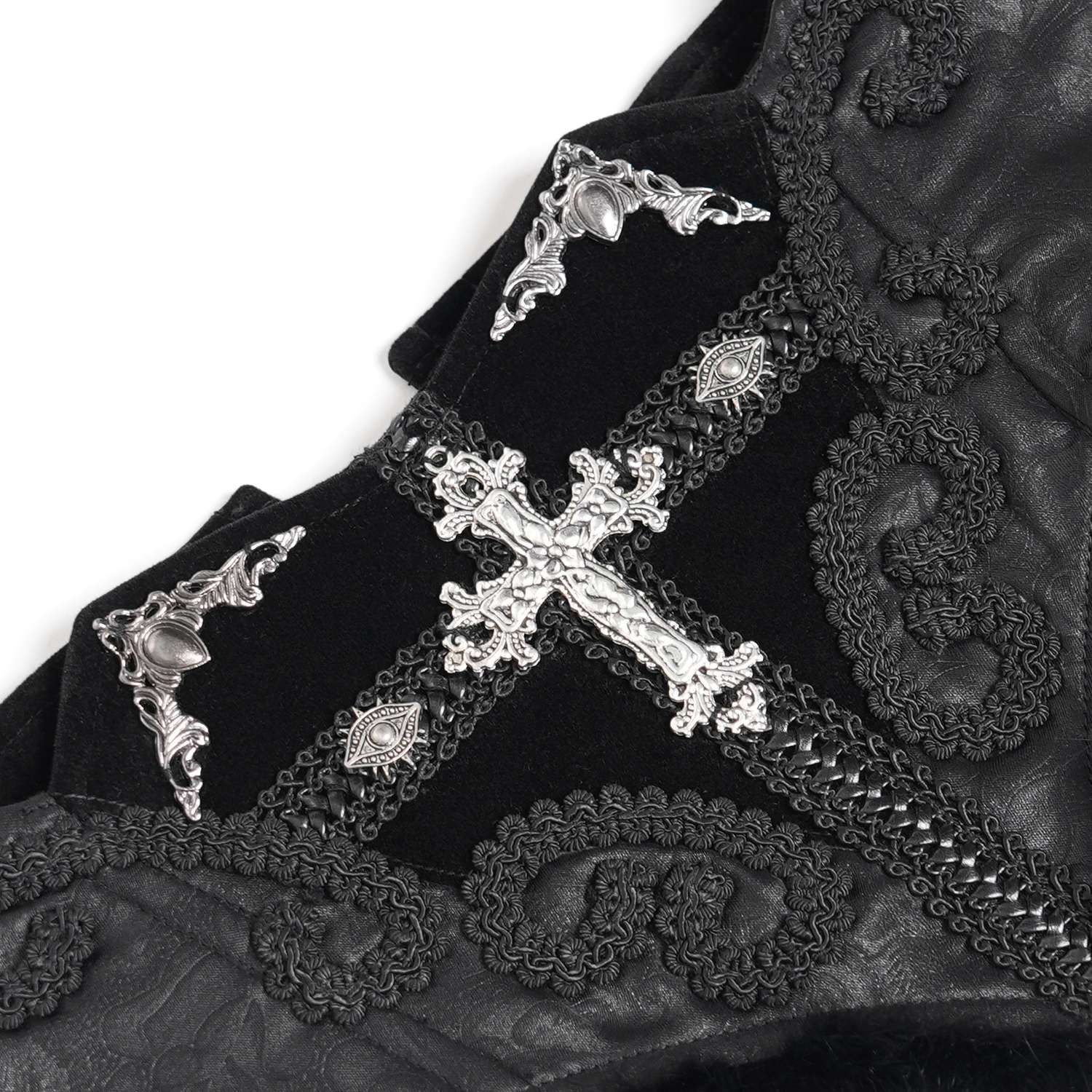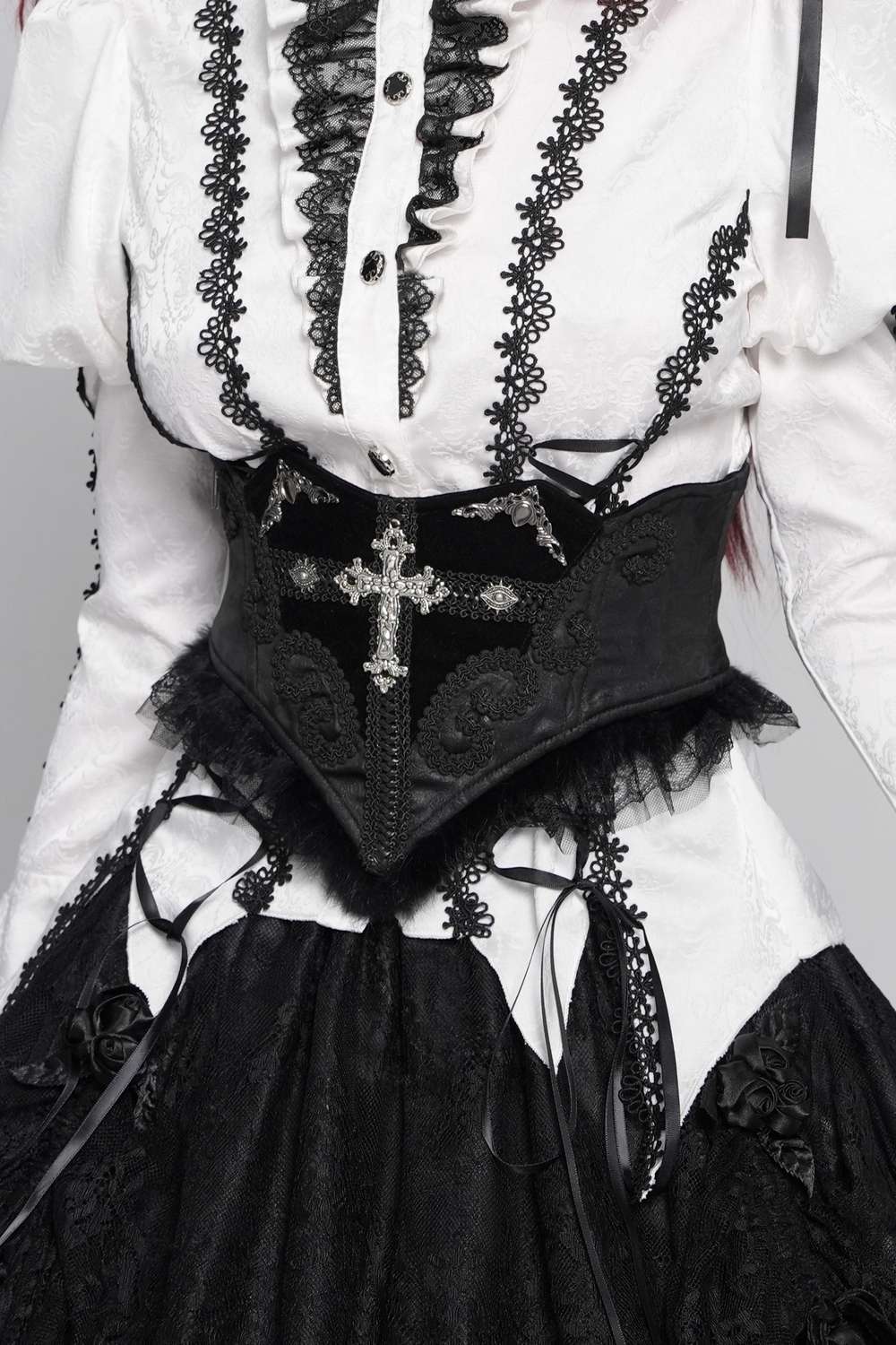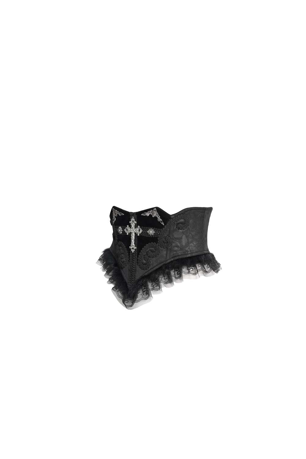 The Aristocrat Waist Belt with Cross by Devil Fashion is a striking romantic gothic accessory designed to cinch the waist and add dramatic flair to your outfits. Its wide corset silhouette features ornamental black fabric and intricate details, highlighted by a central cross accent that reinforces the gothic aesthetic. A classic lacing at the back allows for an adjustable fit, making it versatile and flattering over dresses, tunics or layered styles. Ideal for gothic fashion, alternative wardrobes, cosplay or any look that demands bold, dark elegance.