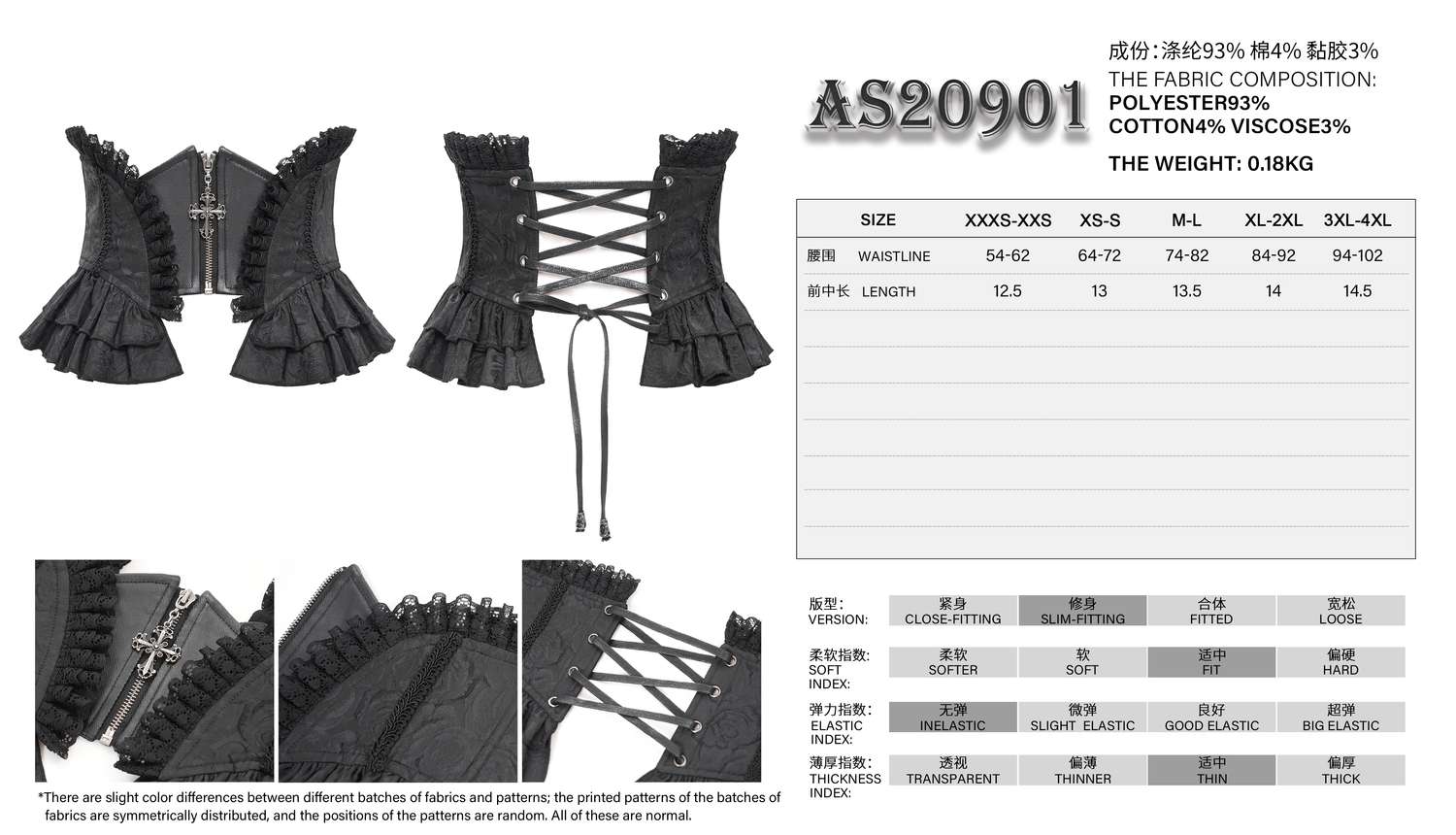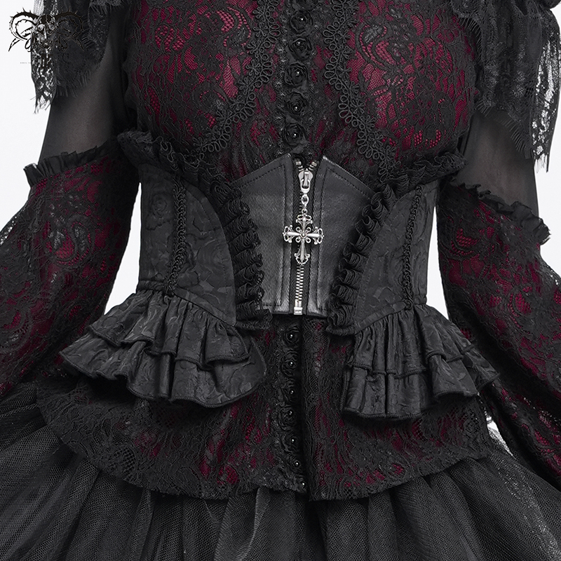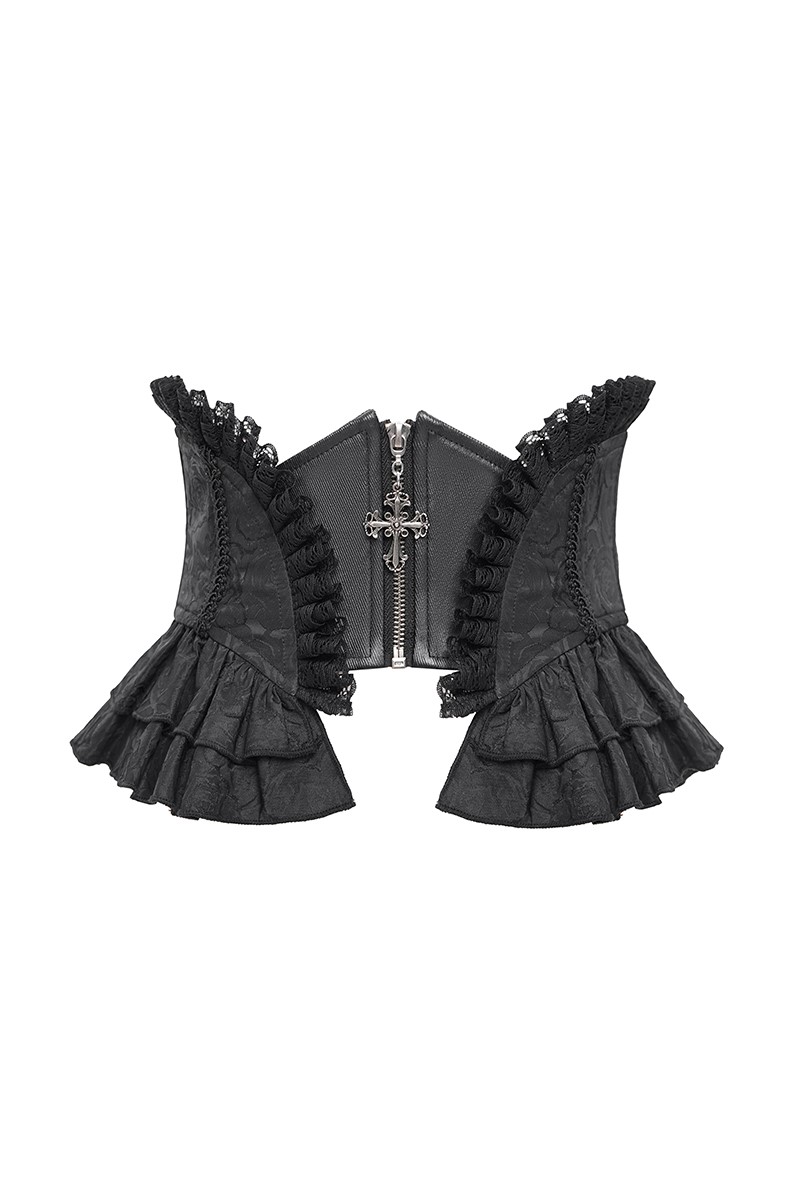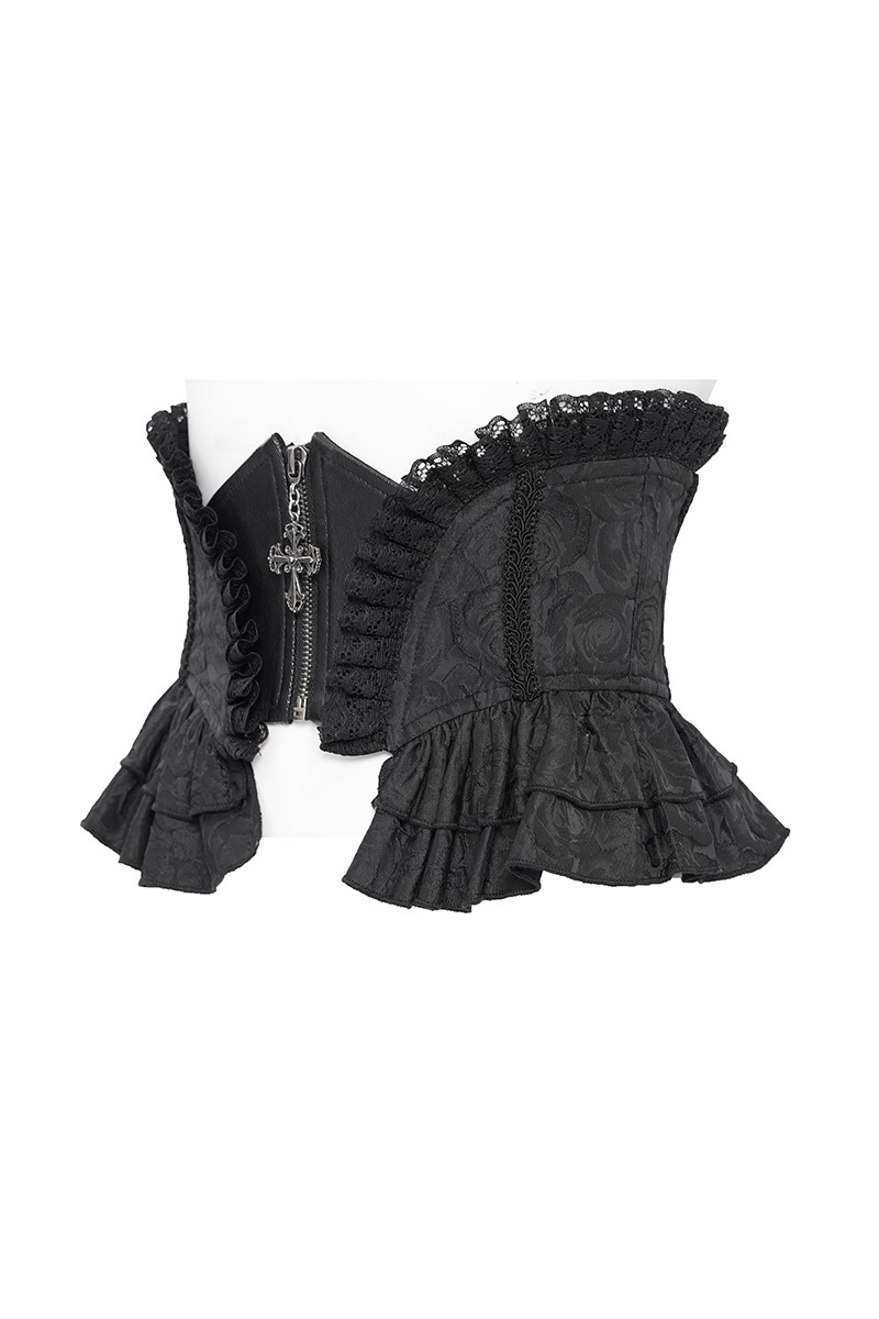 A stylish black Gothic waist belt that perfectly accentuates your silhouette. The material mix combines smooth faux leather details with ornamental fabric, while a short zipper with cross pendant accentuates the front. The belt widens elegantly at the sides and is rounded off by a curved ruffle trim and a short peplum. At the back, faux leather lacing ensures the perfect fit – adjustable in length and individually customizable.
