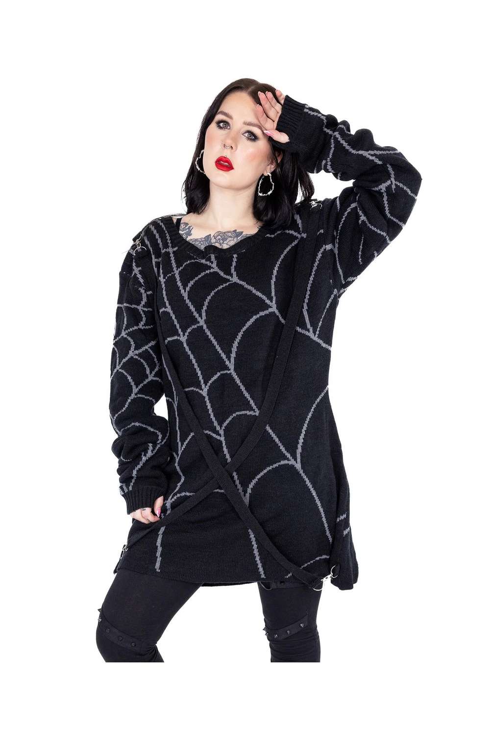 Long-cut, black pullover made of soft knit with a grey spider web pattern - an absolute must-have for cold days!