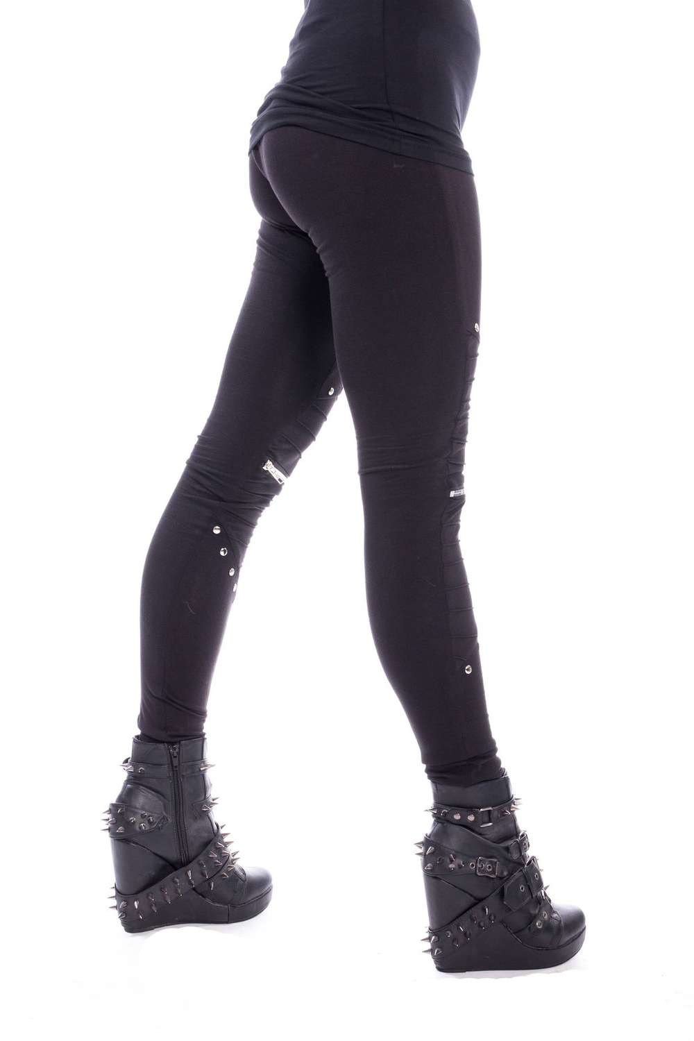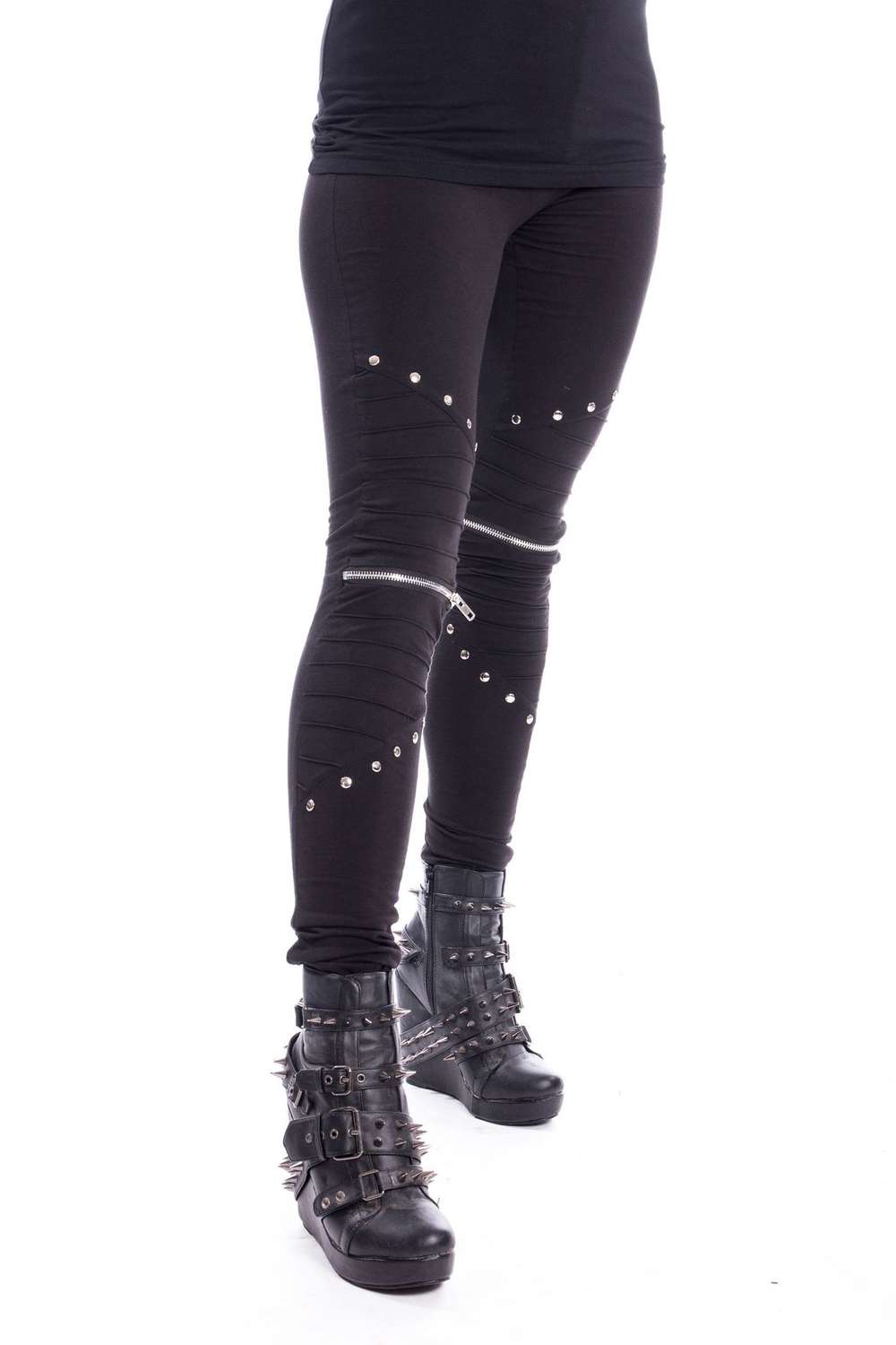 Silver rivets and decorative zippers make the leggings an eye-catcher.