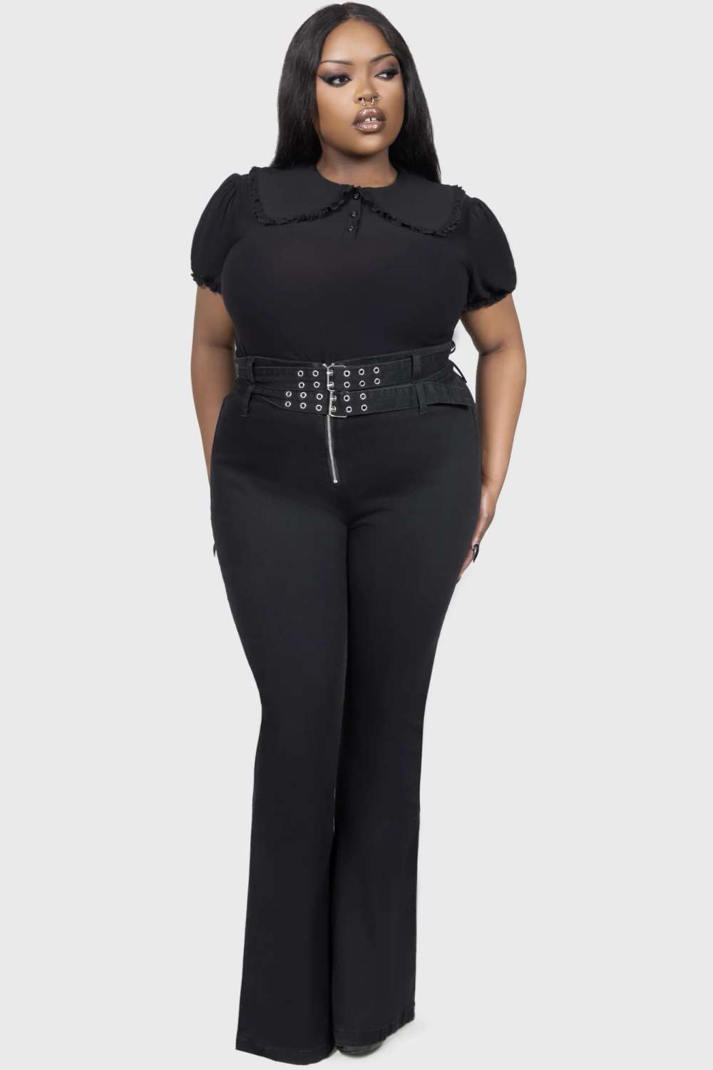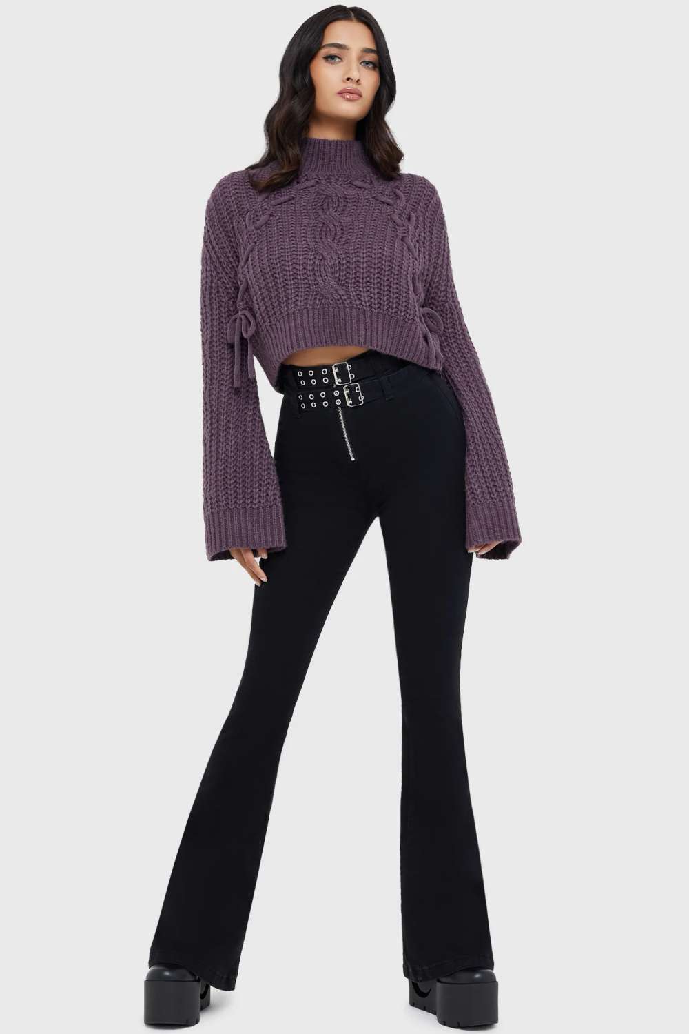 A functional double-belt detail with metal accents adds stylish punk-inspired flair.