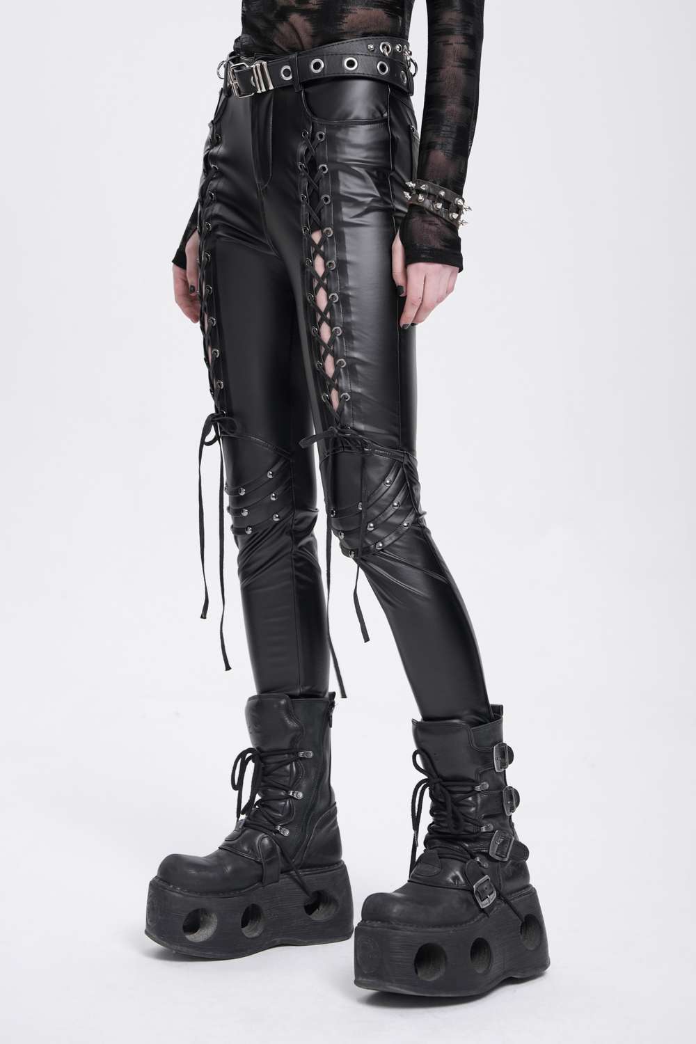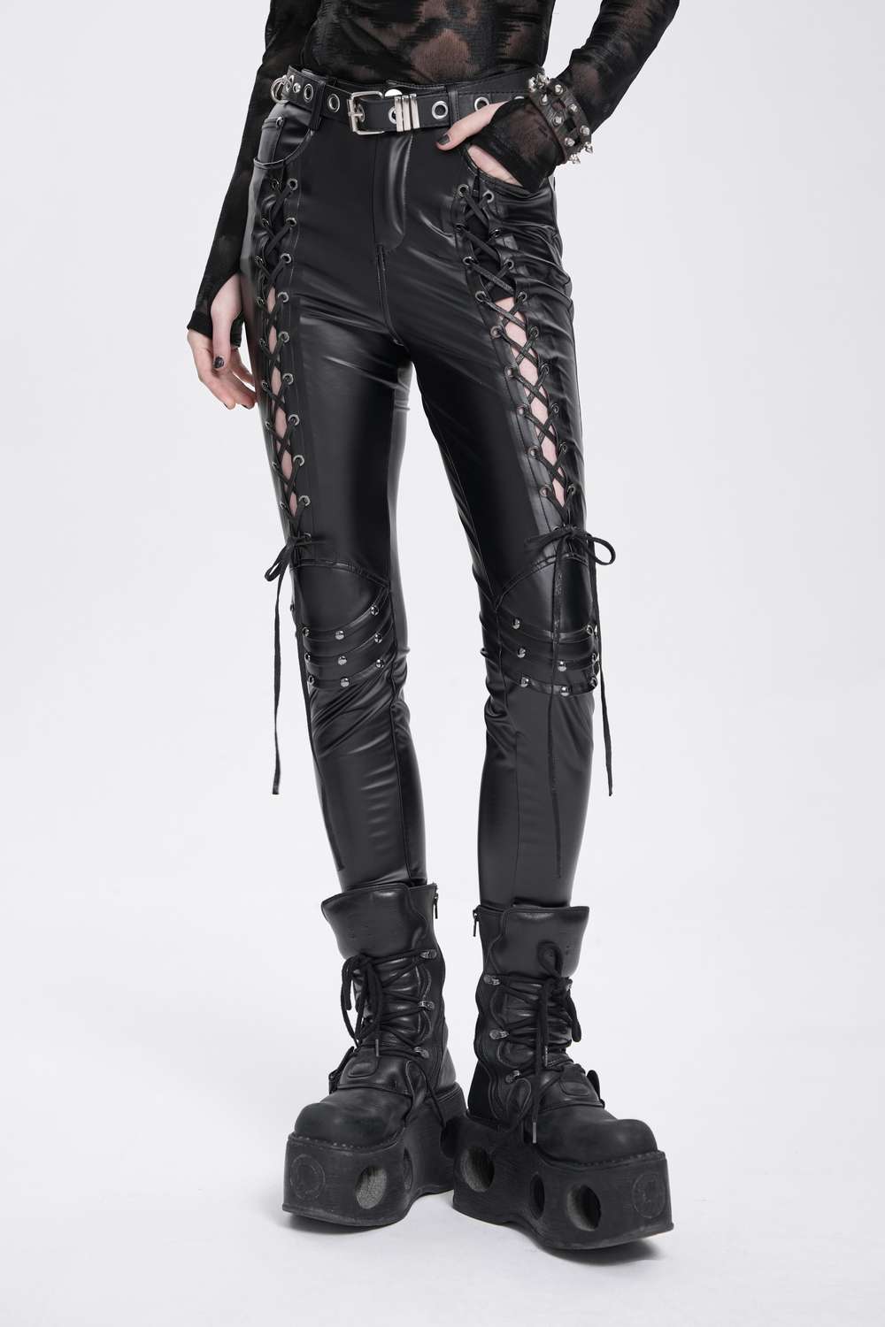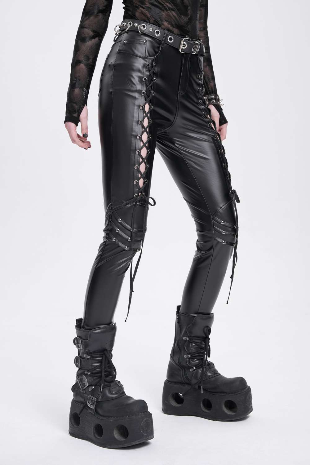 Devil Fashion - Wetlook Faux Leather Pants with Lacing Hose