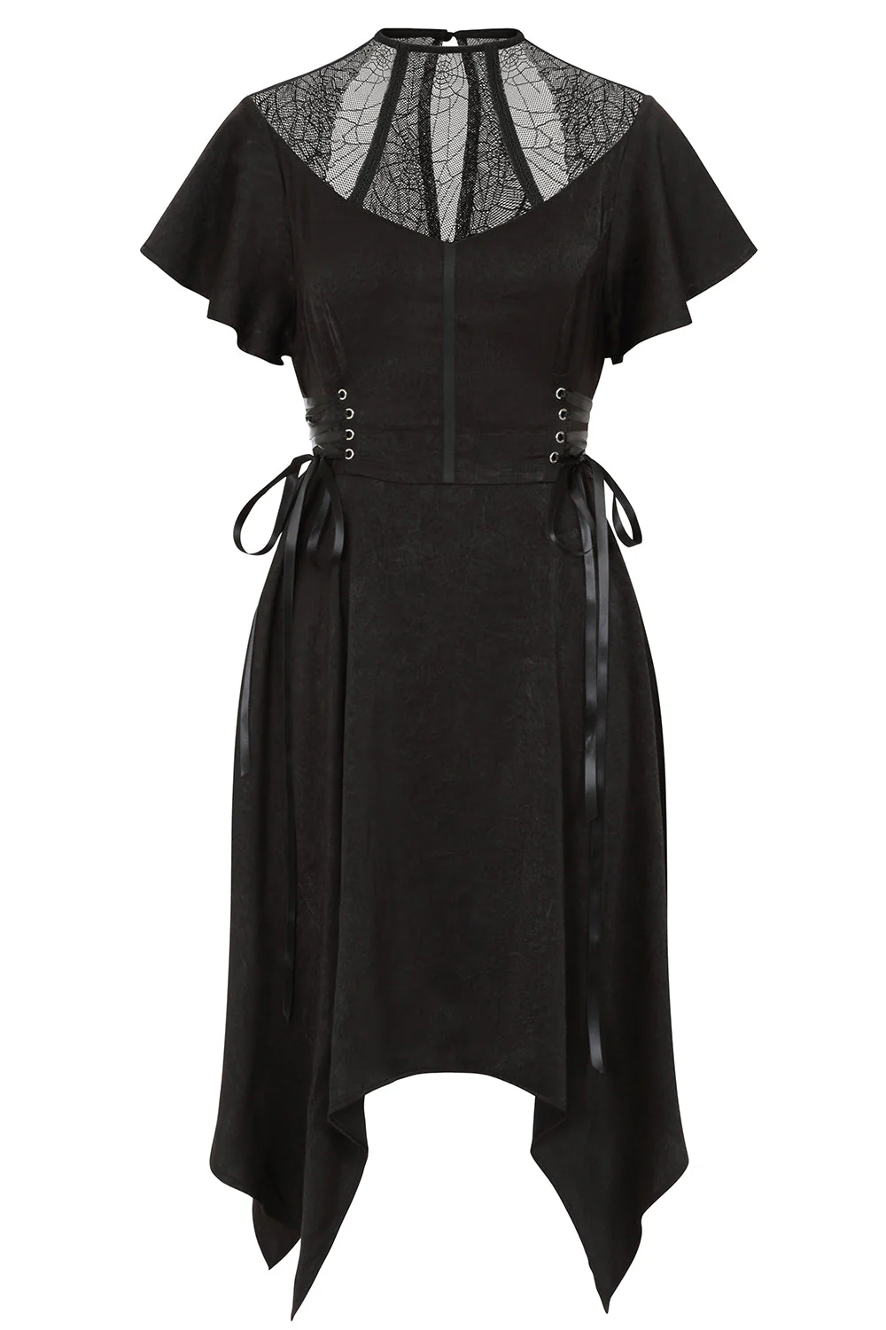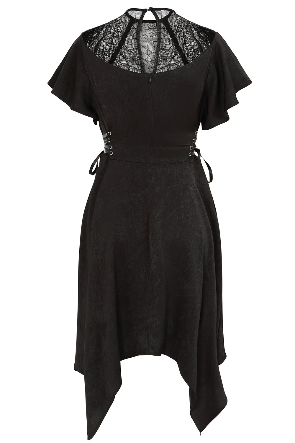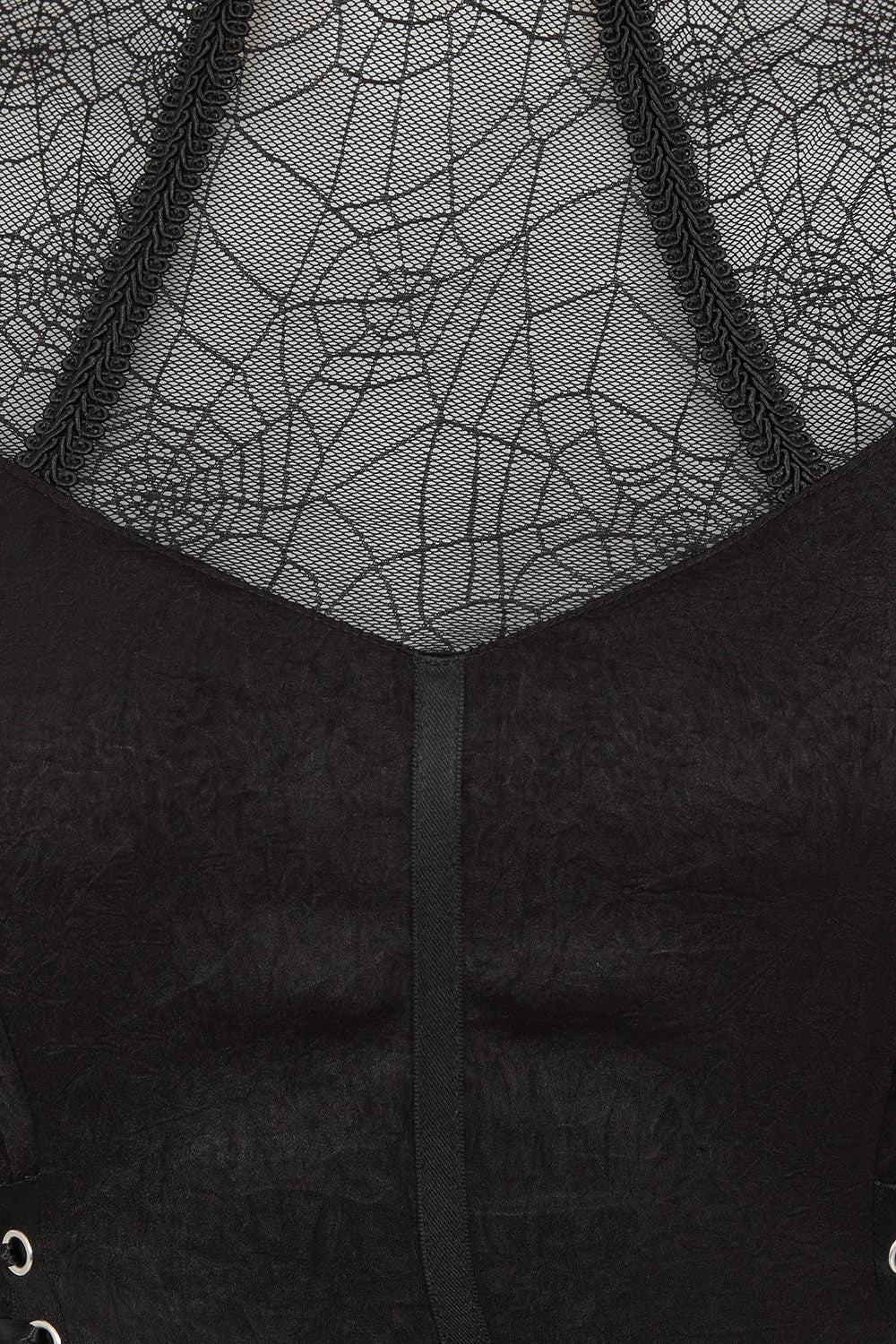 Transparente Spinnenweben-Akzente an Brust und Schultern sorgen für filigrane Details, während der hohe Ausschnitt und die Schnürung an den Seiten eine dramatische Silhouette formen.