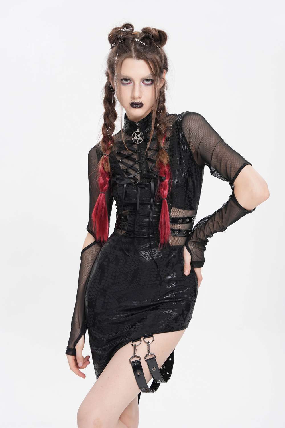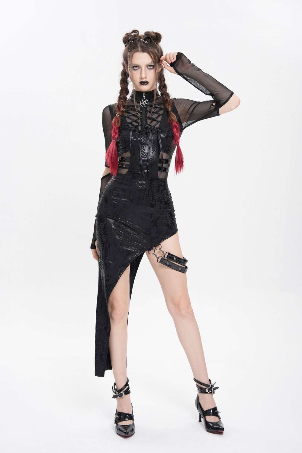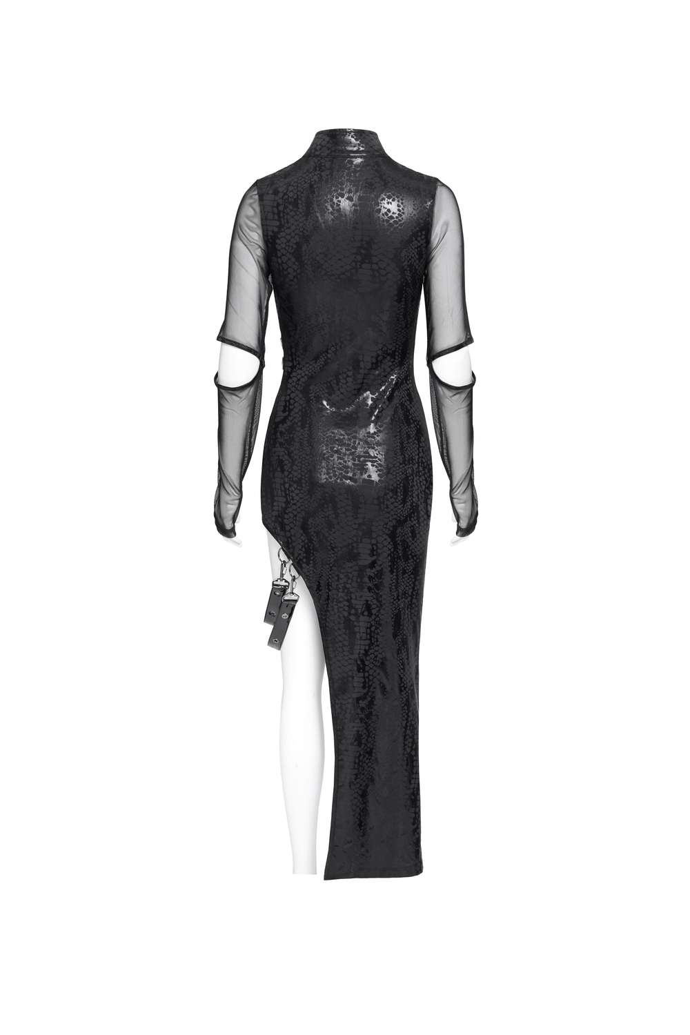 Das Devil Fashion Reptile Leather Look Mesh Dress (SKT237) ist ein eng anliegendes Gothic‑Kleid mit aufregender Reptilien‑Leder‑Optik und transparenten Mesh‑Einsätzen, die für dramatische Akzente sorgen.