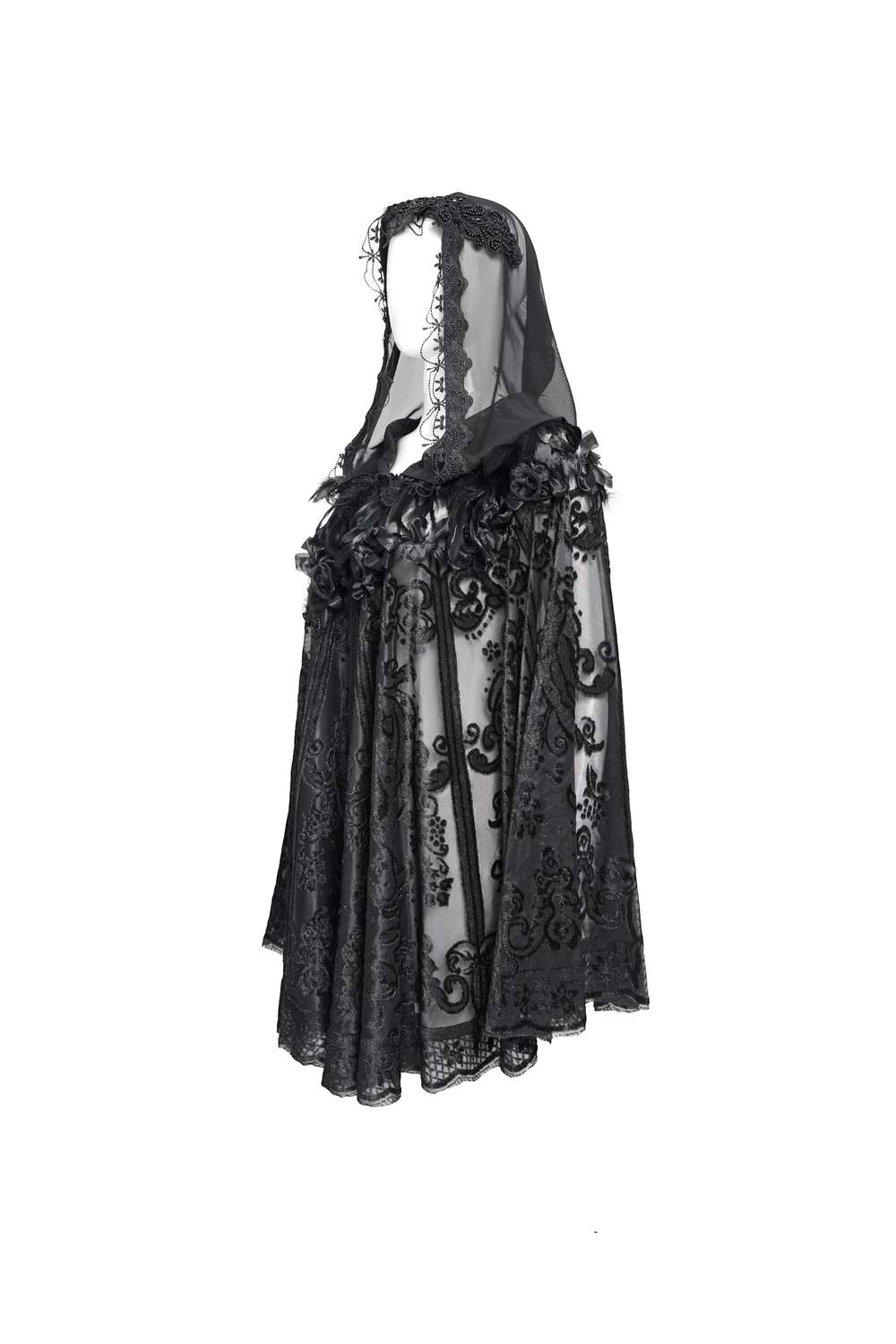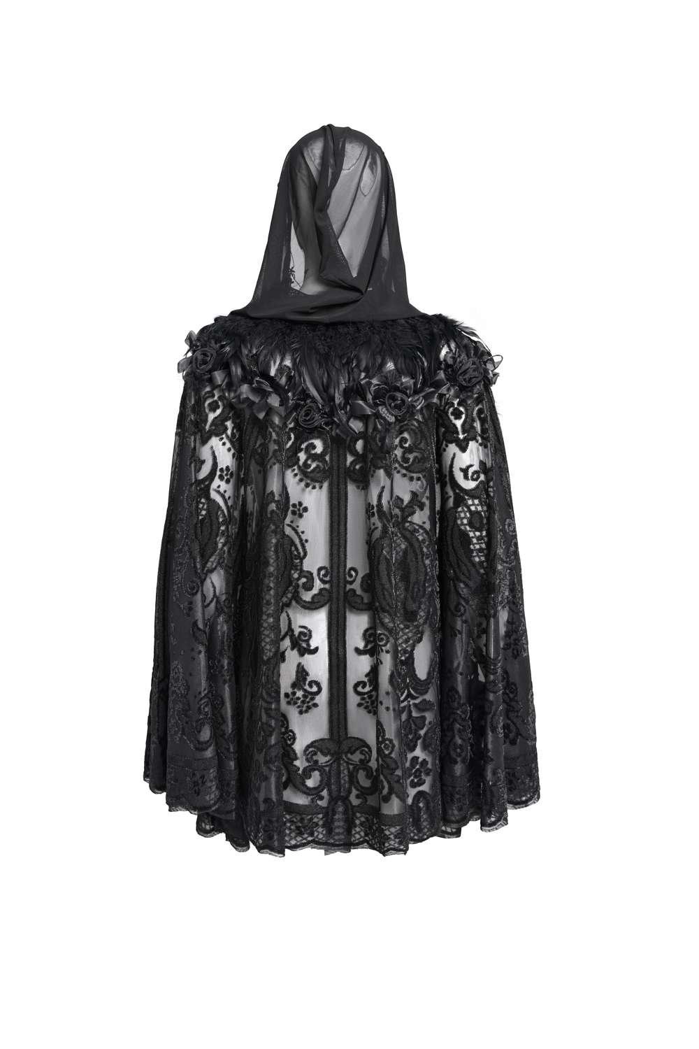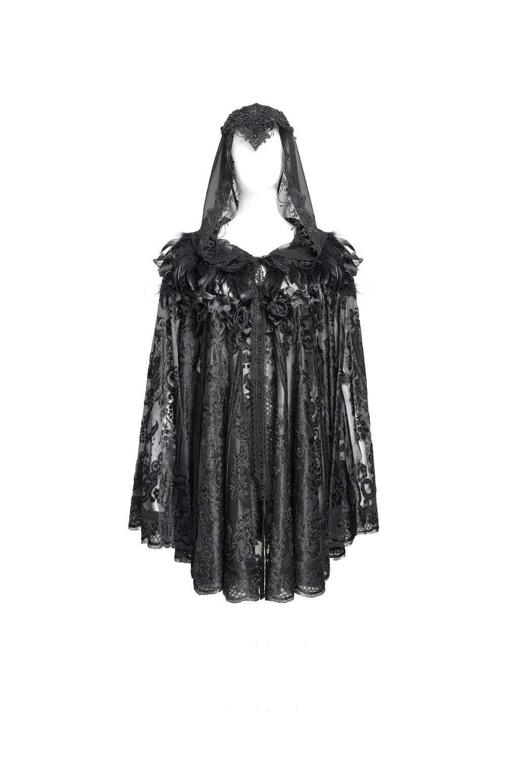 Die Kapuze ist mit einem V‑förmigen Spitzenbesatz versehen, der das Gesicht elegant umrahmt, und am Hals sorgen Spitzenbänder für einen stilvollen Verschluss.