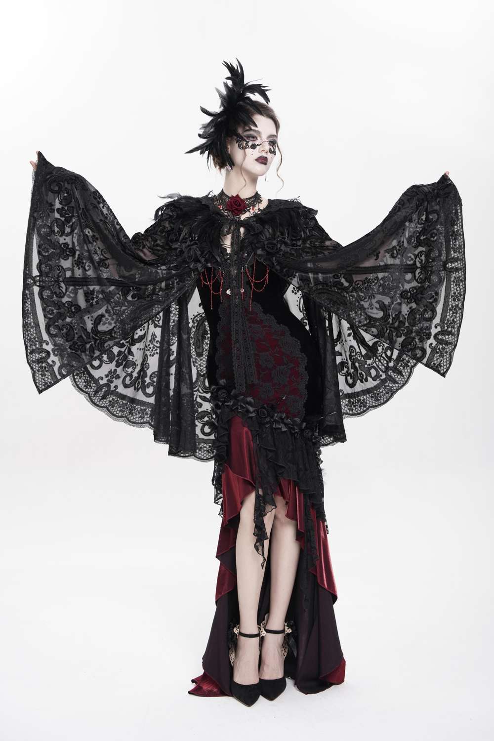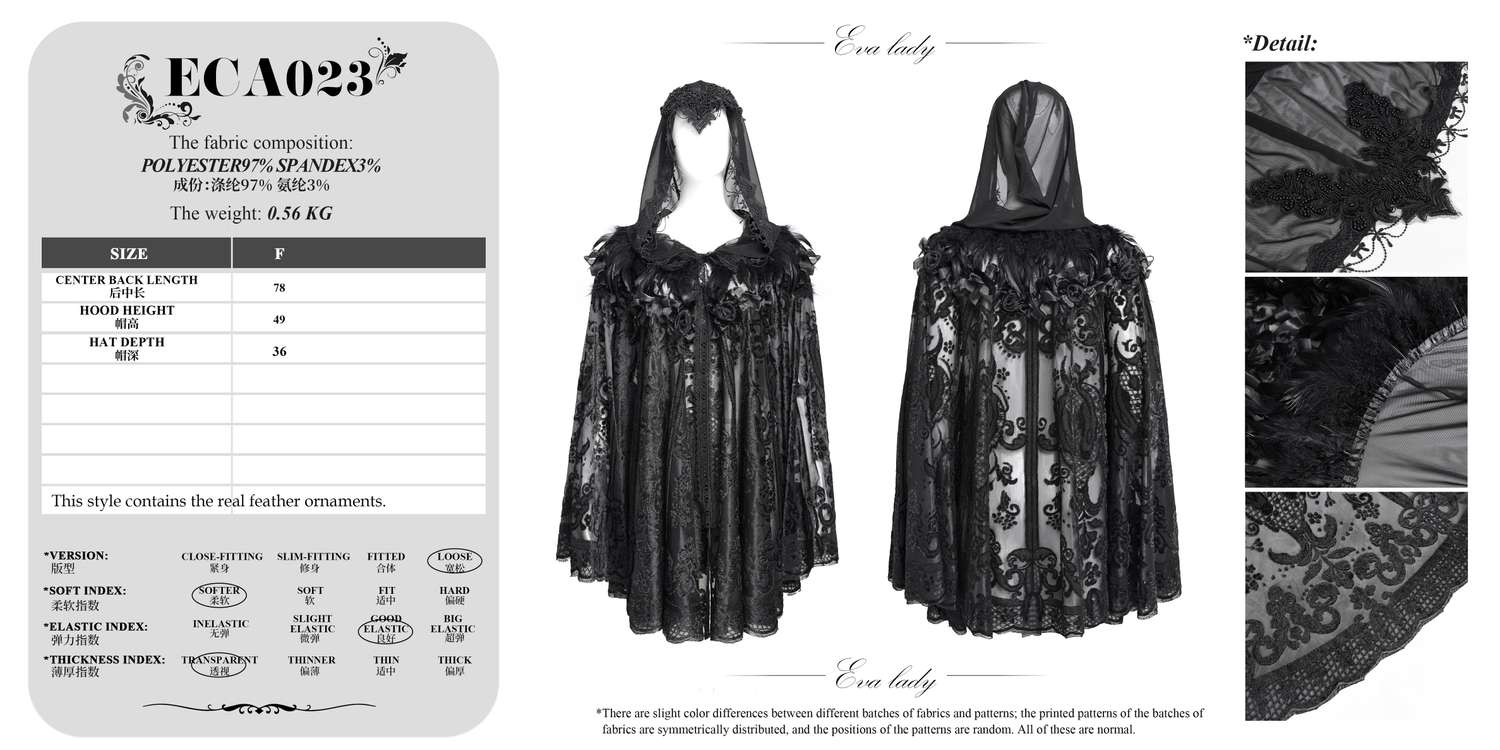 Das Eva Lady - Lace Cape with Floral Design and Feathers ECA023 ist ein schwarzes Gothic‑Cape aus transparenter Spitze mit floralen und ornamentalen Spitzenmustern, das jedem Outfit einen dramatischen Akzent verleiht.