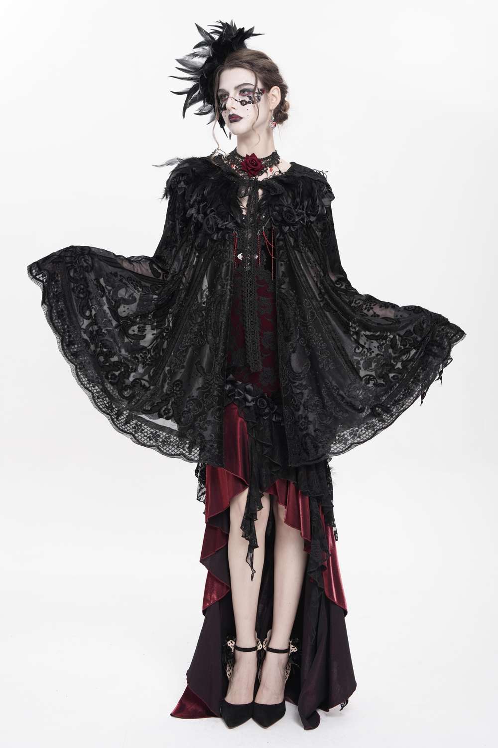 Schwarze Federn am Kragen verstärken den mystischen Gothic‑Look und machen das Cape zu einem besonderen Accessoire für Festival‑, Event‑ oder Abendstylings.