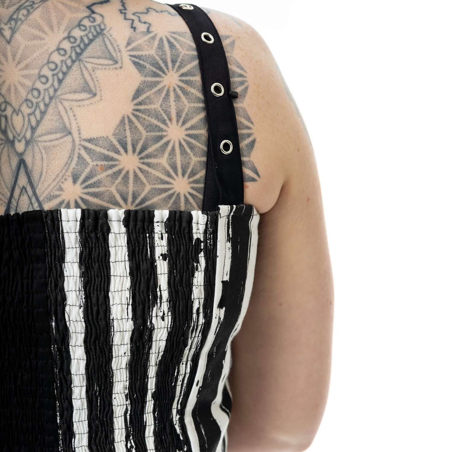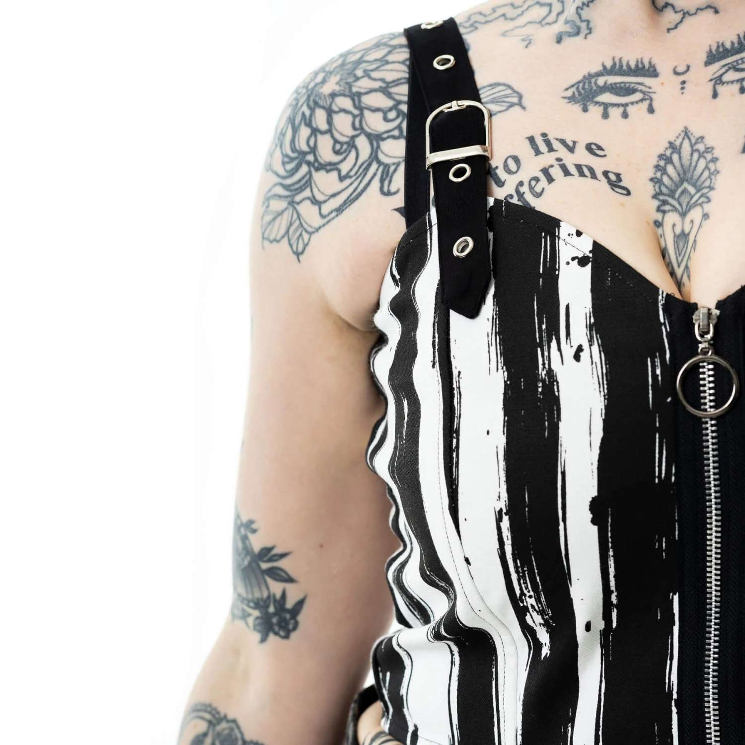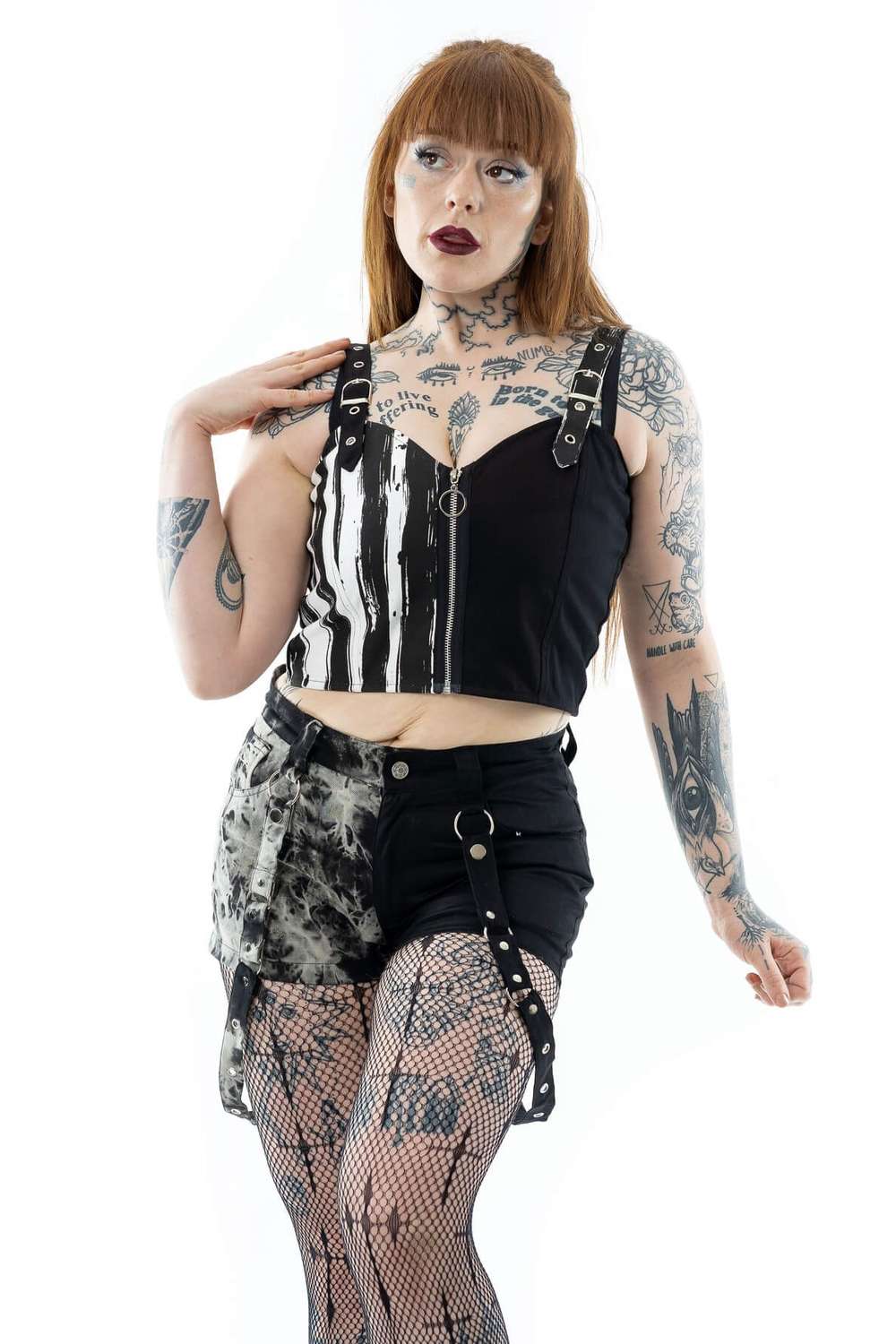 Stylisches Gothic Top im kontrastreichen Schwarz-Weiß-Design – die rechte Seite zeigt ein auffälliges Streifenmuster, während die linke Seite in tiefem Schwarz gehalten ist.