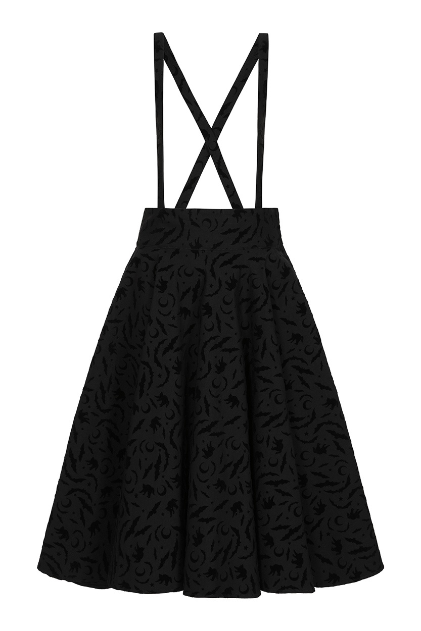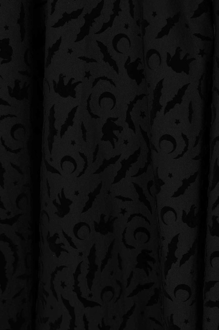 Der Banned - Cecilia Halloween Rock ist ein schwarzer, rockabilly‑inspiriert gestalteter Rock mit samtigem Halloween‑Print, auf dem Fledermäuse, Mondsicheln und Katzen abgebildet sind.