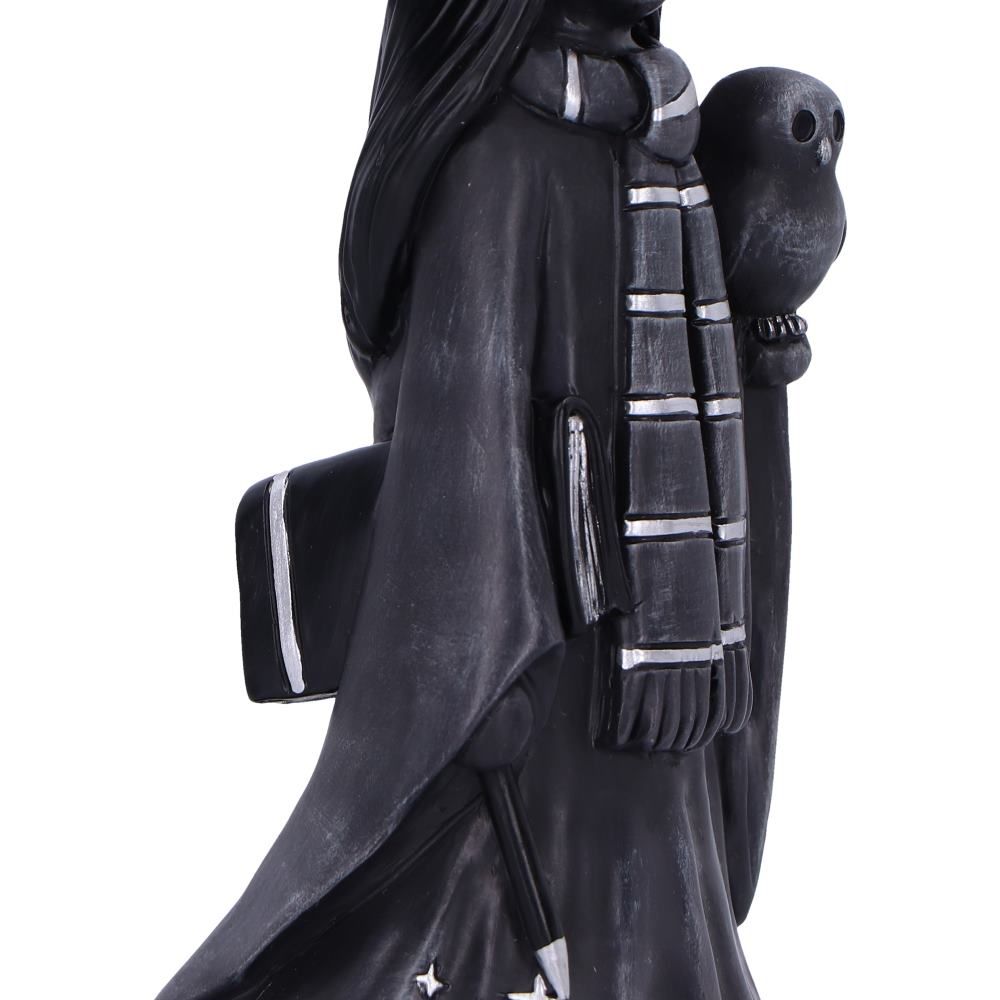 Die detailreiche Figur aus hochwertigem Polyresin ist handbemalt und kombiniert tiefschwarze Töne mit silbernen Akzenten, die ihre Gothic‑Ästhetik unterstreichen.