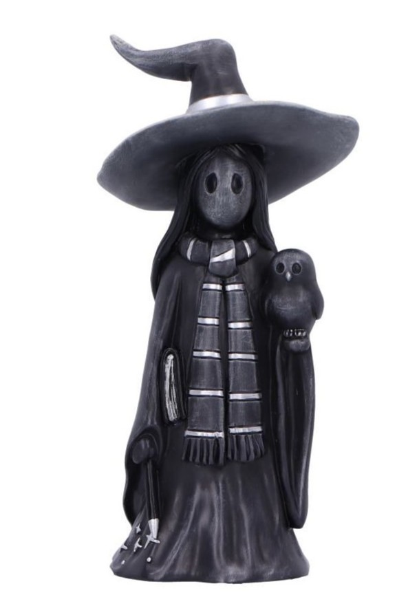 Die Nemesis Now Little Souls Gleam Figur zeigt eine magische Hexen‑Seele mit spitzem Hexenhut, Zauberstab, alten Zauberbüchern und einer weisen Eule auf dem Arm, die zusammen eine mystische, fantasievolle Atmosphäre ausstrahlen.
