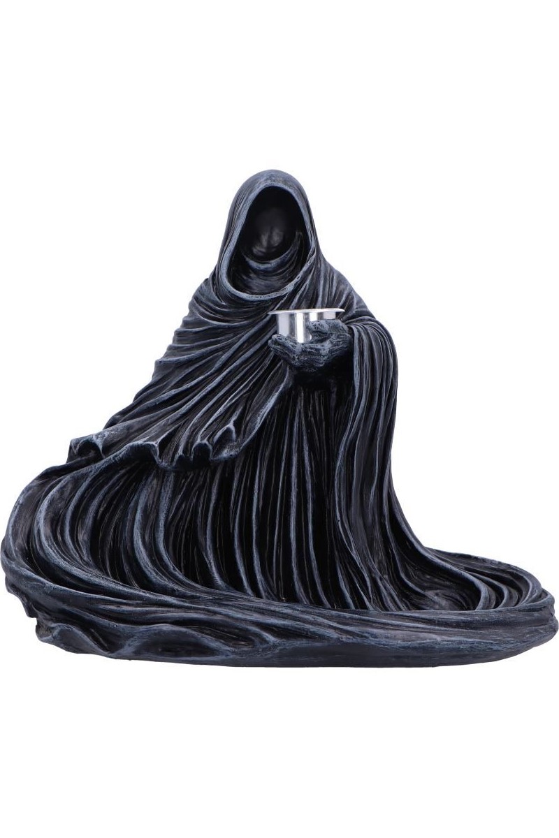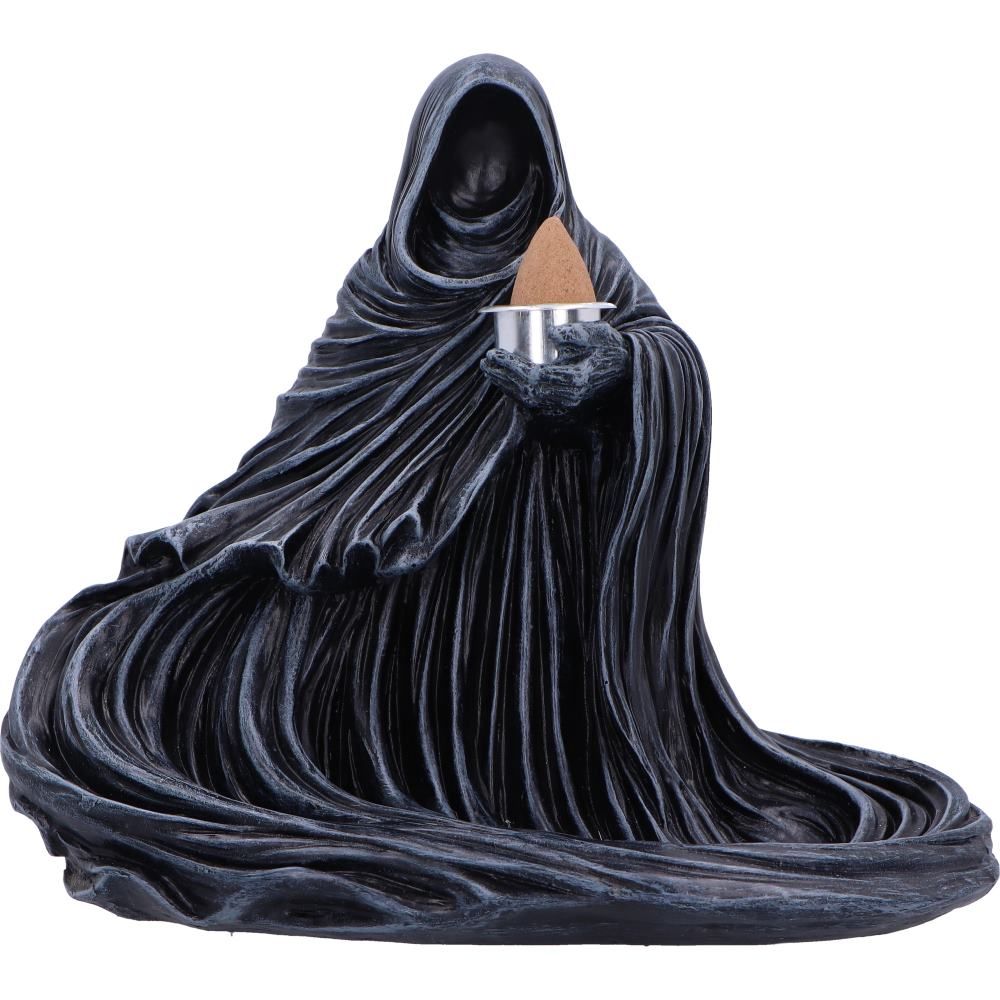 Der Nemesis Now The Last Scent Backflow Incense Burner zeigt eine mystische, gesichtslose Sensenmann-Figur in wehenden Gewändern, die mit einem Backflow-Räucherkegel einen faszinierenden Rauch-Wasserfall erzeugt.