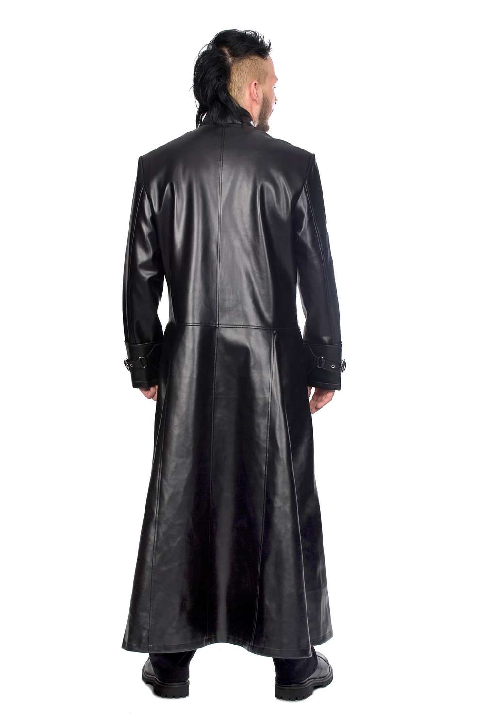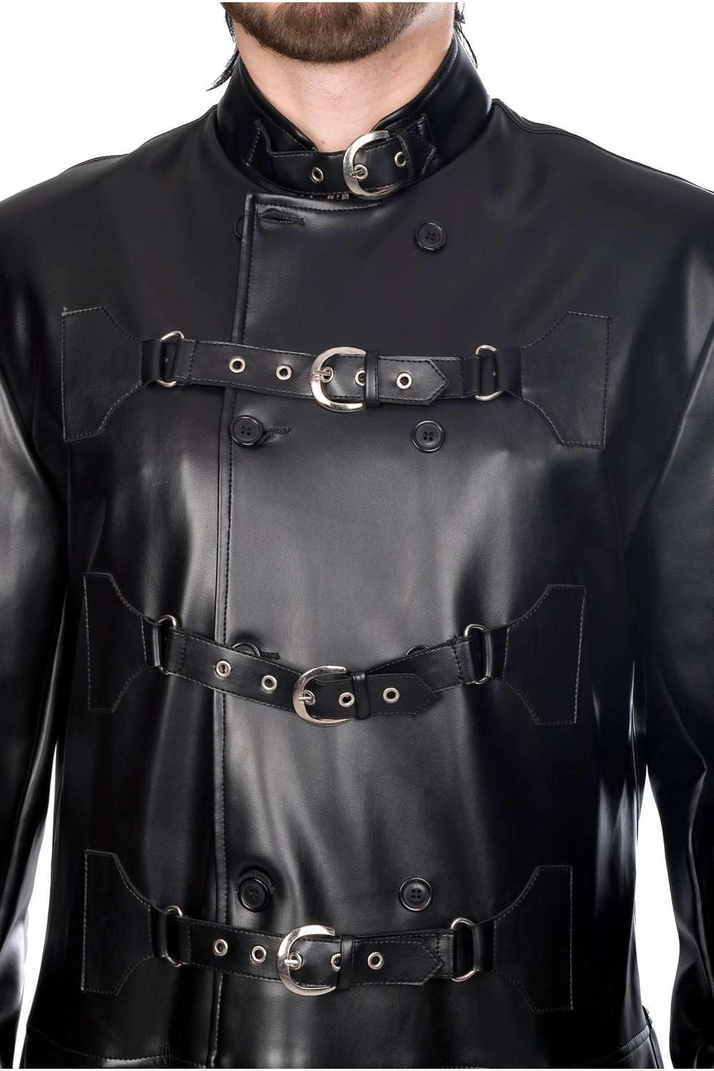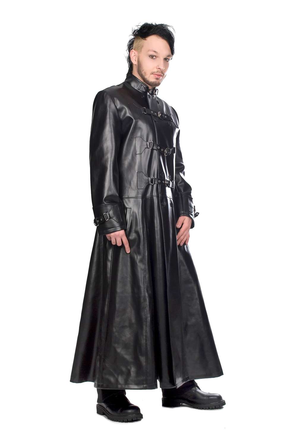 Der Black Pistol – Closure Coat Sky Mantel ist ein extra langer Mantel aus Lederimitat mit markanten Schnallen an Vorderseite, Kragen und Manschetten.